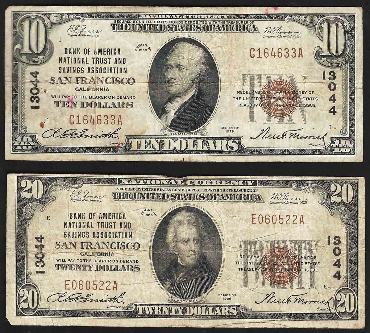 One Set of 1929 $10 & $20 San Francisco CA National Currency Notes CH# 13044.