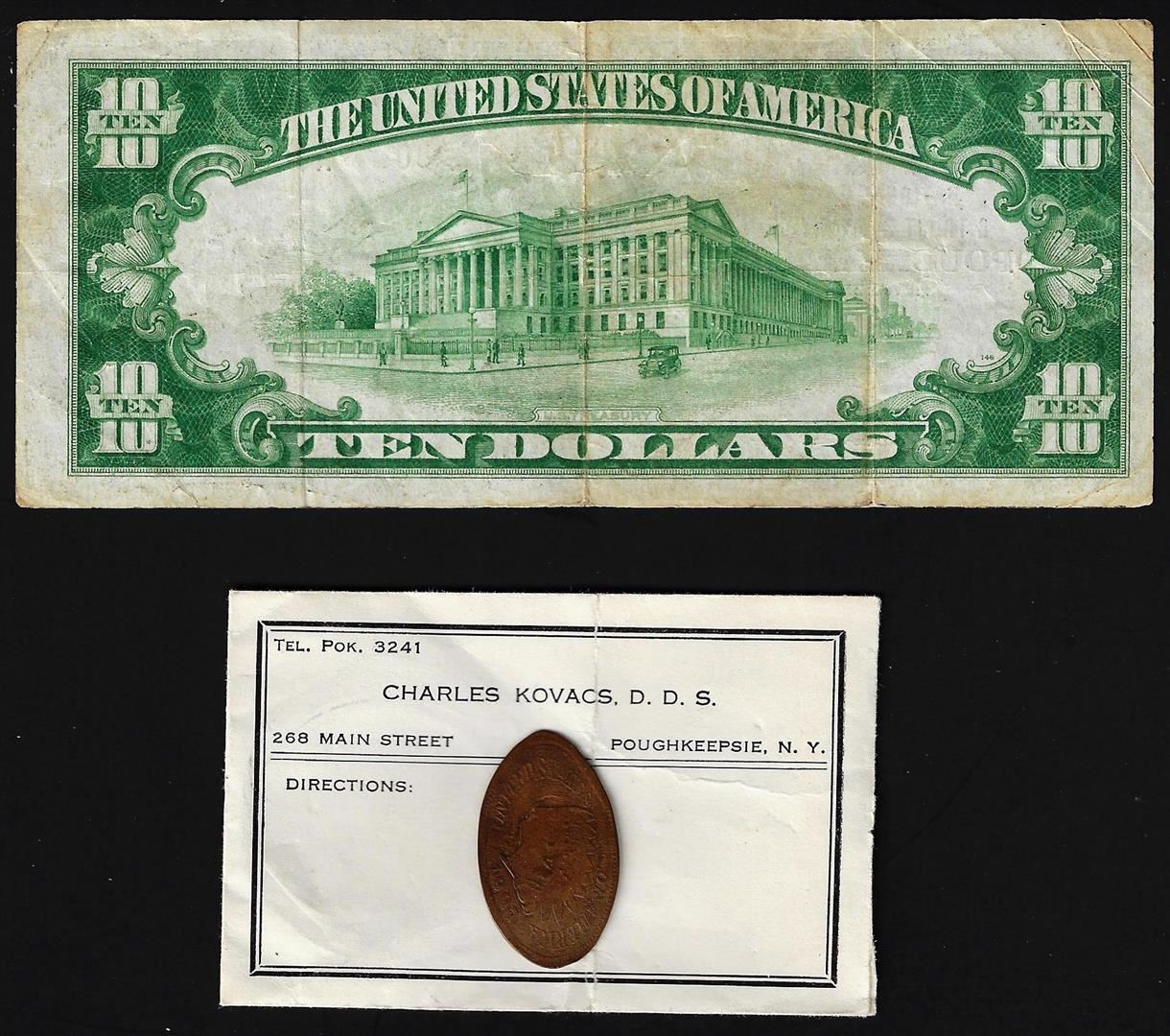 One Set of 1929 $10 Poughkeepsie National Note & 1909 Poughkeepsie, NY Fireman Cent.