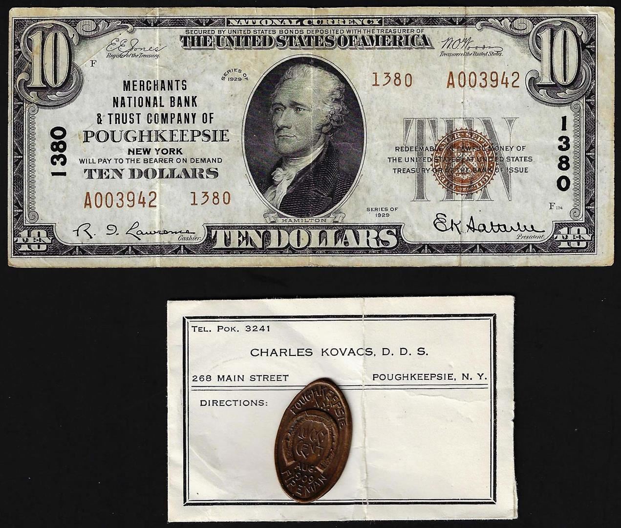 One Set of 1929 $10 Poughkeepsie National Note & 1909 Poughkeepsie, NY Fireman Cent.