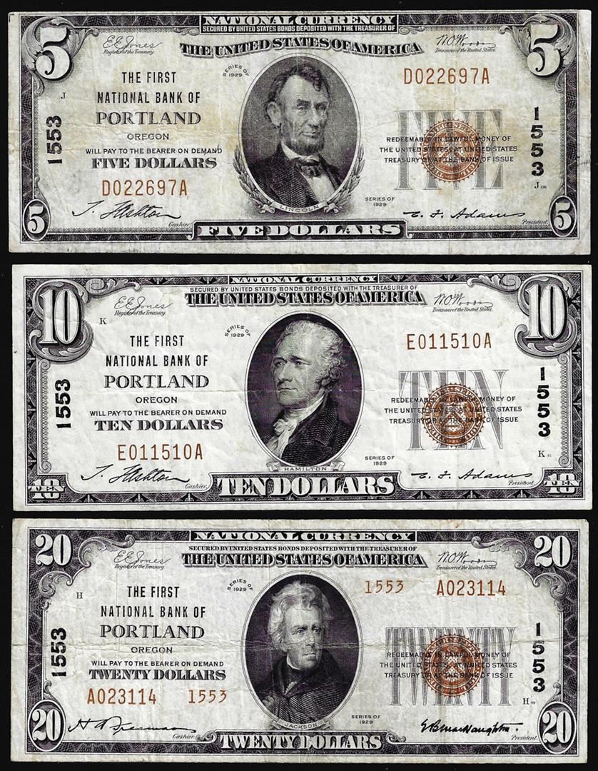 Set of 1929 $5/$10/$20 NB Portland, OR CH# 1553 National Currency Notes