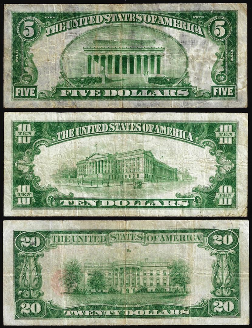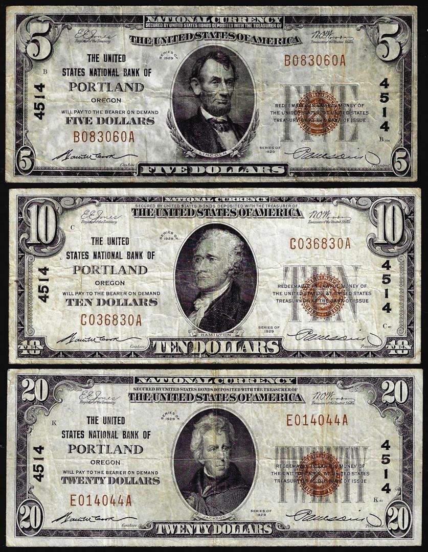 One Set of 1929 $5/$10/$20 United States NB Portland, OR CH# 4514 National Currency Notes.