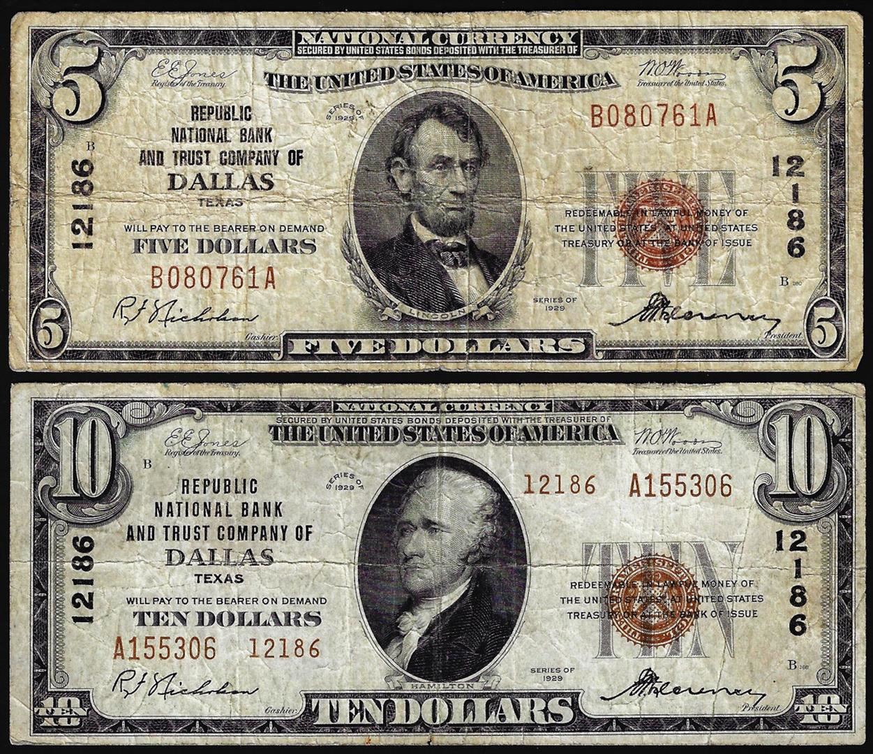 Set of 1929 $5/$10 NB of Dallas, TX CH# 12186 National Currency Notes