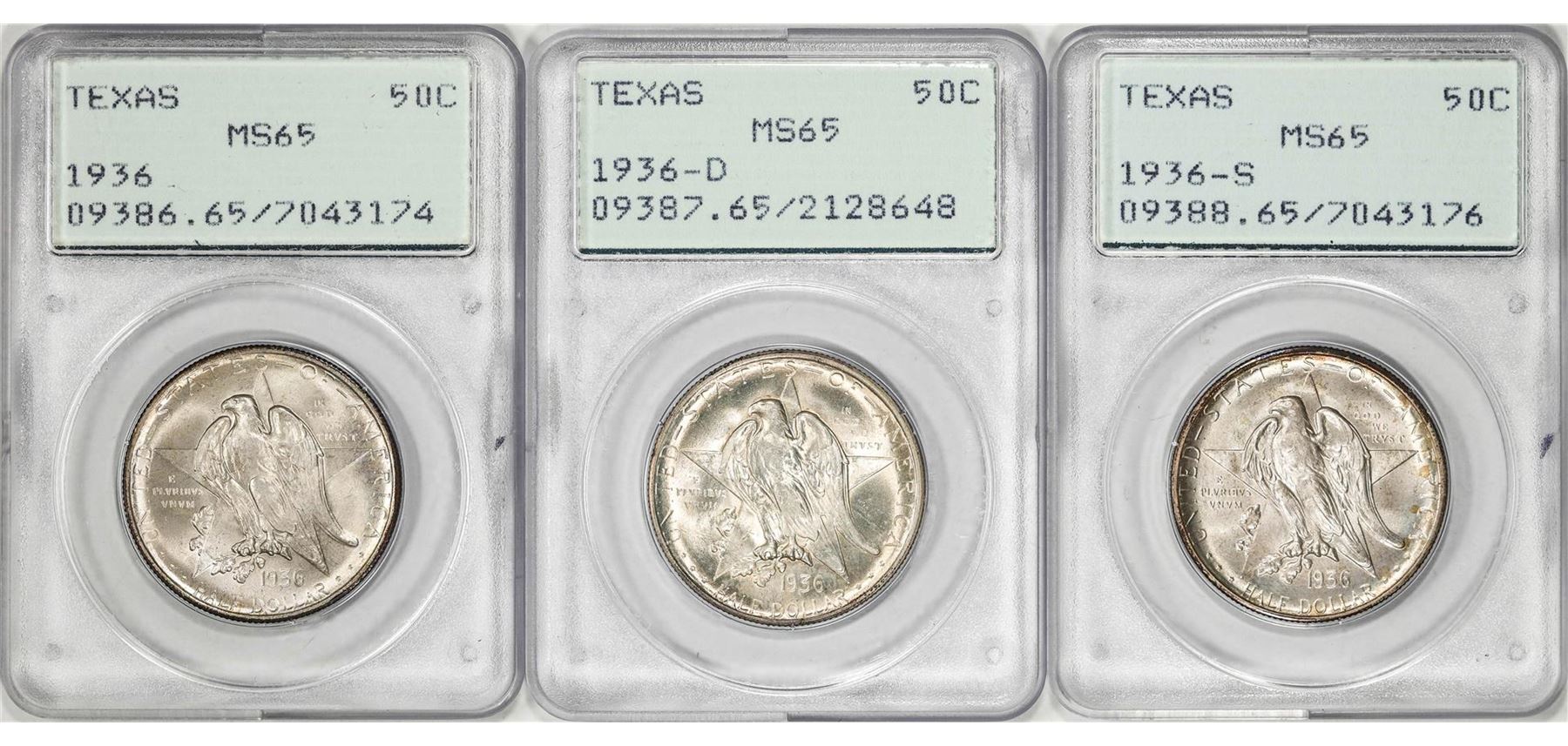 One Set of 1936 P/D/S Texas Commemorative Half Dollar Coins PCGS MS65 Old Green Rattlers. PCGS Graded.