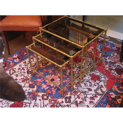 Set of 1940s French Bagues style nesting tables. Brass bamboo and original smoked glass tops with mercury glass borders. Functional and stylish. From Nice.
