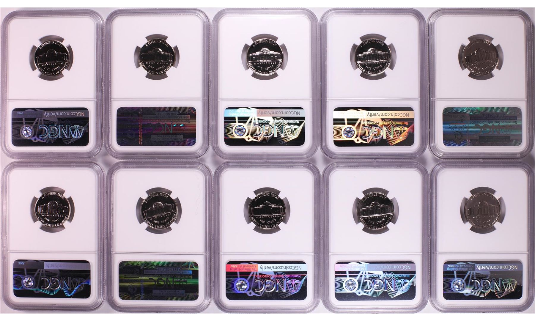 One Set of 1955-1964 Proof Jefferson Nickel Coins NGC PF68. NGC Certified.