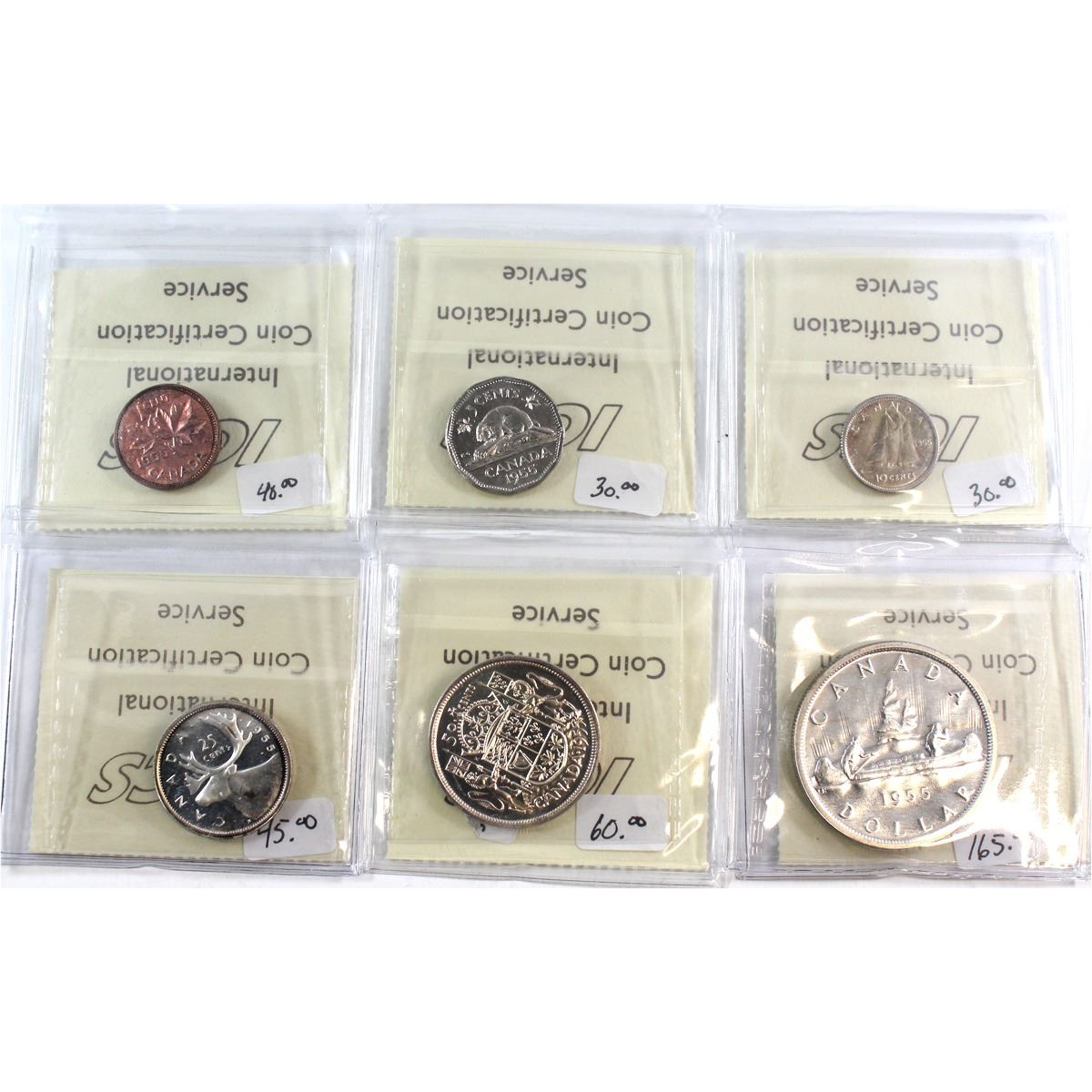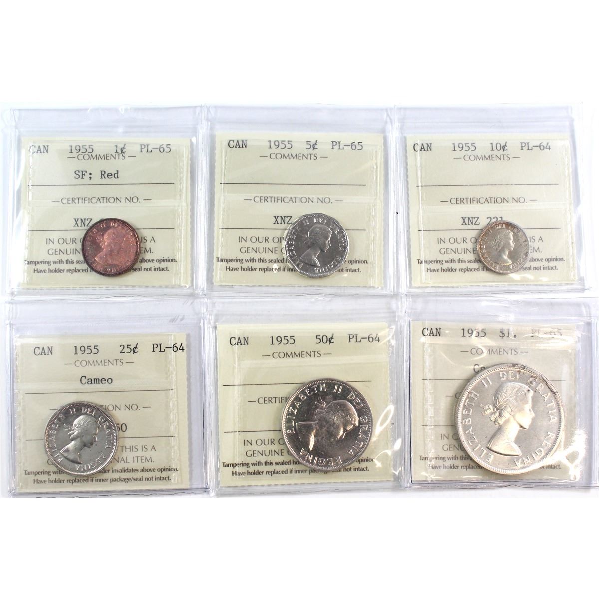 Set of 1955 Canada Coins ICCS Certified: 1-cent SF PL-65, 5-cent PL-65, 10-cent PL-64, 25-cent PL-64 Cameo, 50-cent PL-64, and Silver $1 PL-65 Cameo. 6pcs