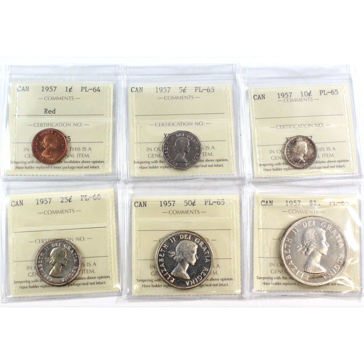 Set of 1957 Canada Coins ICCS Certified: 1-cent PL-64, 5-cent PL-65, 10-cent PL-65, 25-cent PL-66, 50-cent PL-65, and Silver $1 PL-65 Cameo. 6pcs