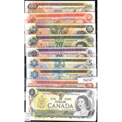 A set of 1969-1979 Multi-Coloured notes. One Dollar 1973 BC-46b, ten consecutive BAPs, Two Dollars 1974 BC-47A BB4550428, Five Dollars 1972 BC-48a CP1016769, Five Dollars 1979 BC-53b 30480851512, Ten Dollars 1971 BC-49c-i EEP1166153, Twenty Dollars 1969 BC-50a ER3596700, Twenty Dollars 1979 BC-54a 50091997726, Fifty Dollars 1975 BC-51a-i EHA9953530 and One Hundred Dollars 1975 BC-52b AJK7126789. Total eighteen notes, AU-Uncirculated and better, mostly Uncirculated