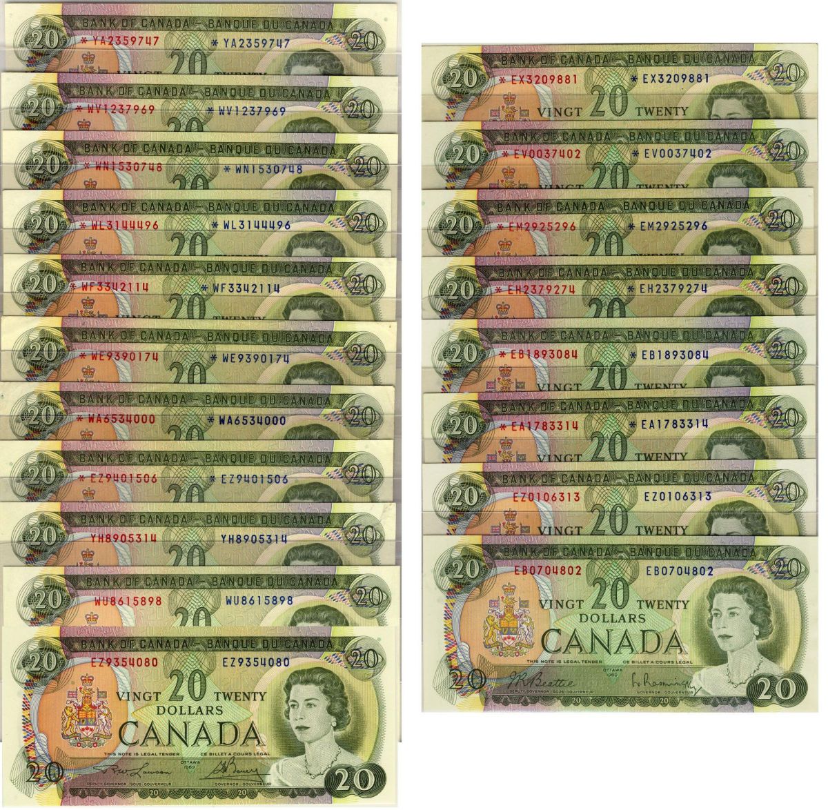 Set of 1969 $20 notes. Complete set of 19 notes. Includes BC-50a #EB0704802, #EZ0106313, BC-50aA #*EA1783314, *EB1893084, *EH2379274, *EM2925296, *EV0037402 and *EX3209881 and BC-50b #WU8615898, #EZ9354080, #YH8905314, BC-50bA #*EZ9401506, *WA6534000, *WE9390174, *WF3342114, *WL3144496, *WN1530748, *WV1237969 and *YA2359747. Expect high bidding as this is the first time we have ever had the opportunity to offer the complete set including the extremely RARE and ELUSIVE *WA issue. All notes with exception of the *WA grades EF to UNC. The *WA grades VF and is the only one listed as per. Only 2 xamples are known of the *WA and this is one of them.