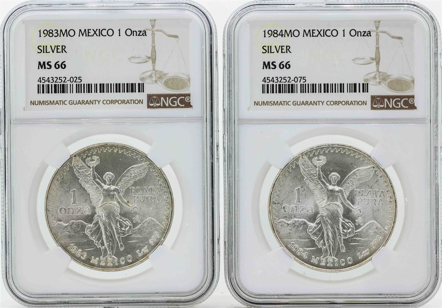 Set of 1983MO-1984MO Mexico 1 Onza Silver Libertad Coins NGC MS66