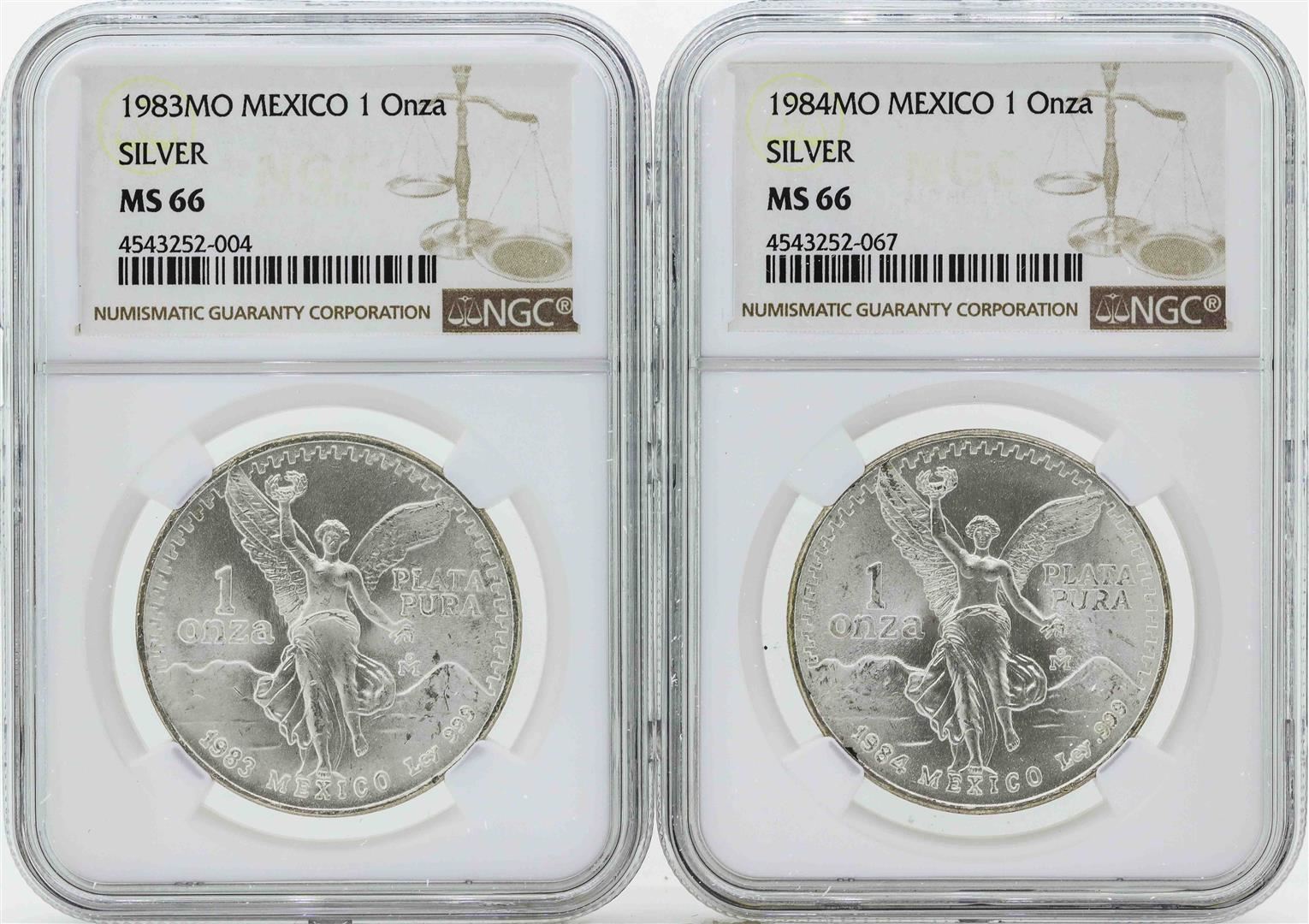 One Set of 1983MO-1984MO Mexico 1 Onza Silver Libertad Coins NGC MS66. NGC Certified.