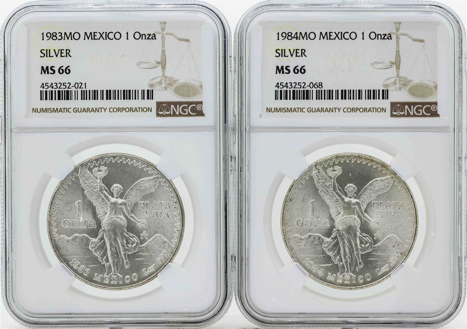 One Set of 1983MO-1984MO Mexico 1 Onza Silver Libertad Coins NGC MS66. NGC Certified.
