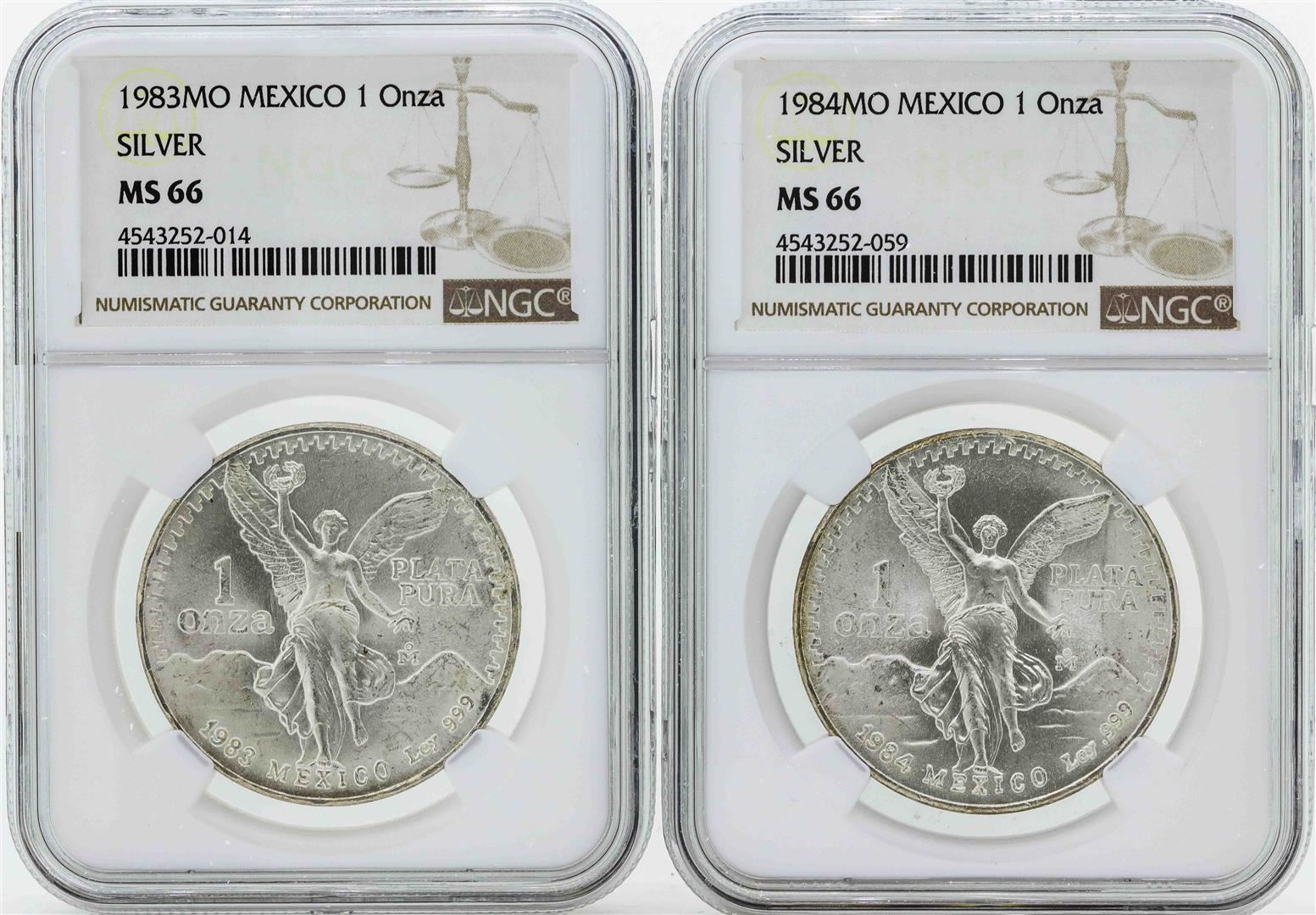 Set of 1983MO-1984MO Mexico 1 Onza Silver Libertad Coins NGC MS66