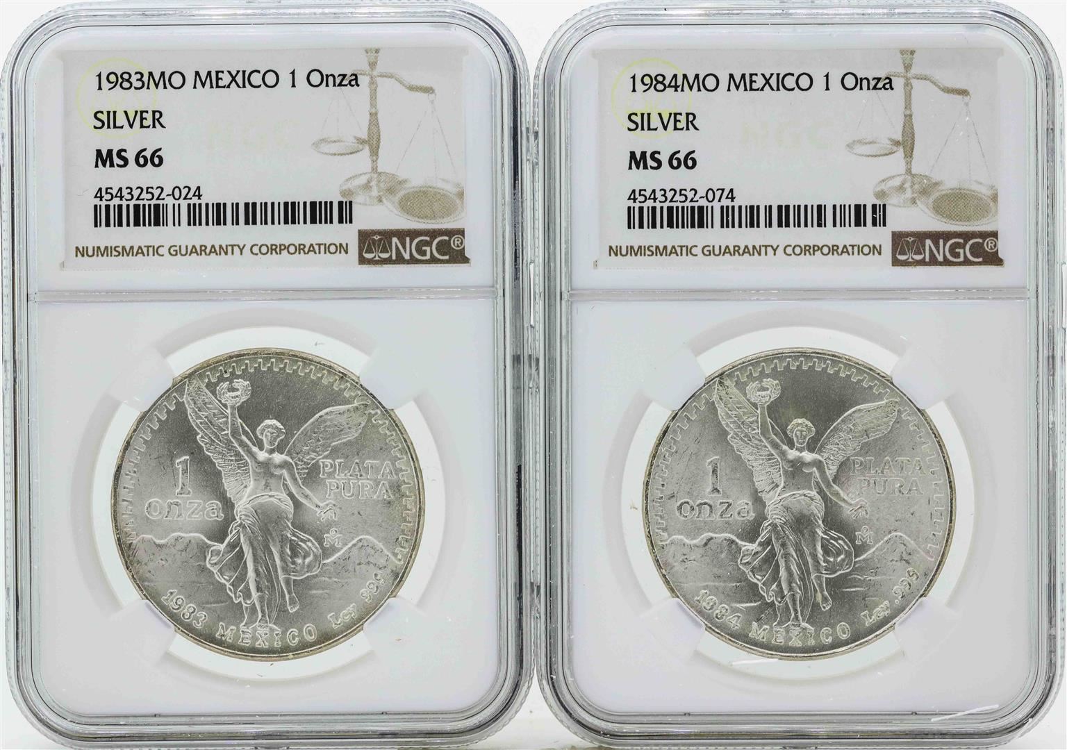 Set of 1983MO-1984MO Mexico 1 Onza Silver Libertad Coins NGC MS66