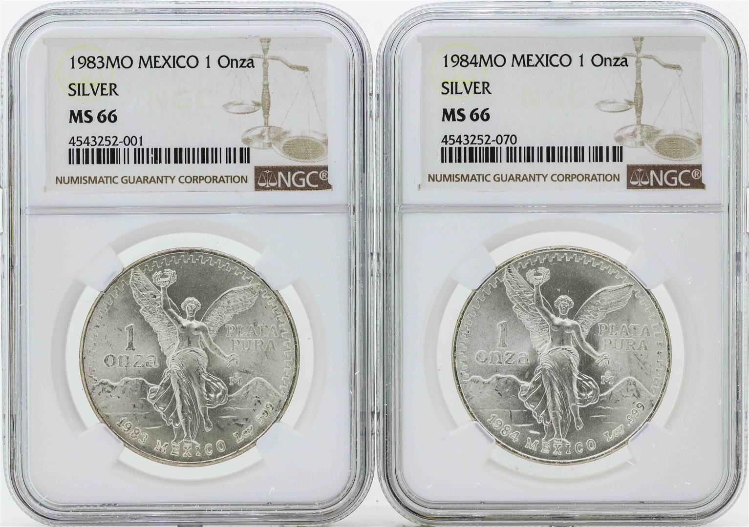 Set of 1983MO-1984MO Mexico 1 Onza Silver Libertad Coins NGC MS66