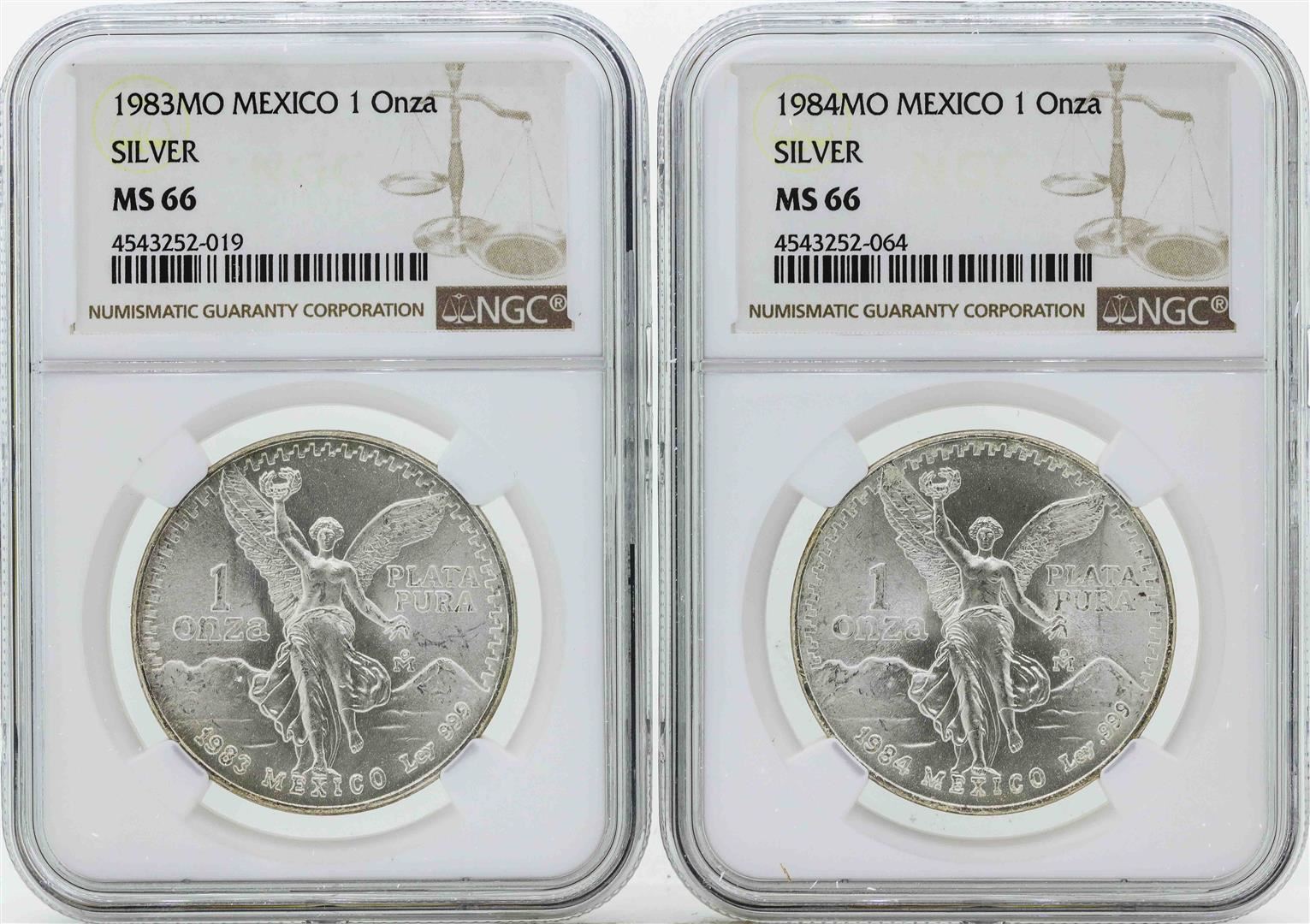 Set of 1983MO-1984MO Mexico 1 Onza Silver Libertad Coins NGC MS66