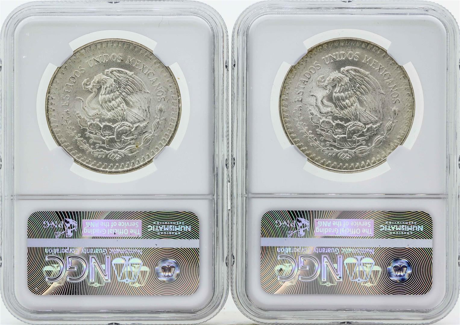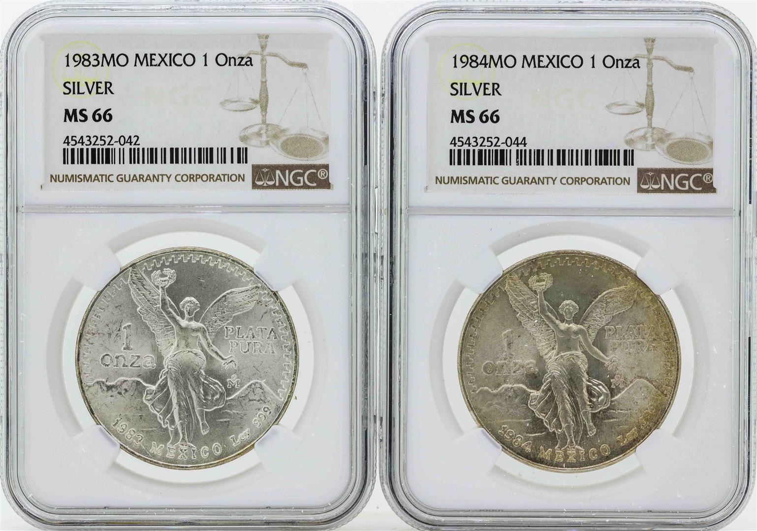 One Set of 1983MO-1984MO Mexico 1 Onza Silver Libertad Coins NGC MS66. NGC Certified.