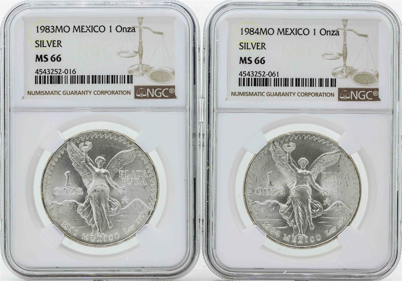 Set of 1983MO-1984MO Mexico 1 Onza Silver Libertad Coins NGC MS66
