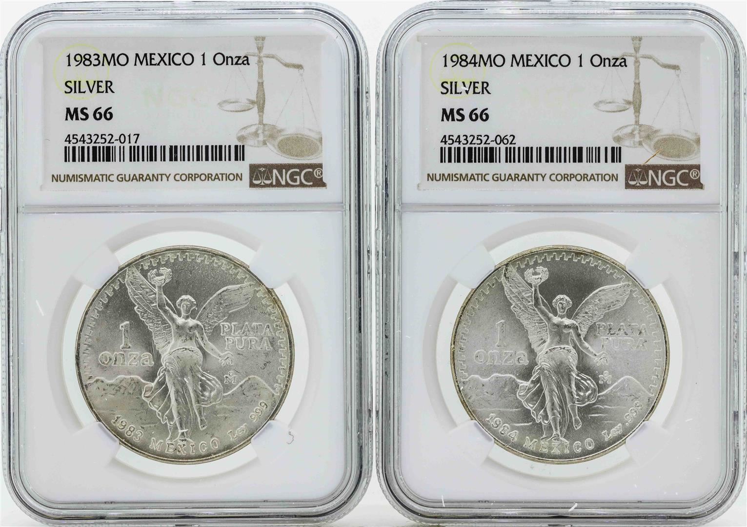 Set of 1983MO-1984MO Mexico 1 Onza Silver Libertad Coins NGC MS66