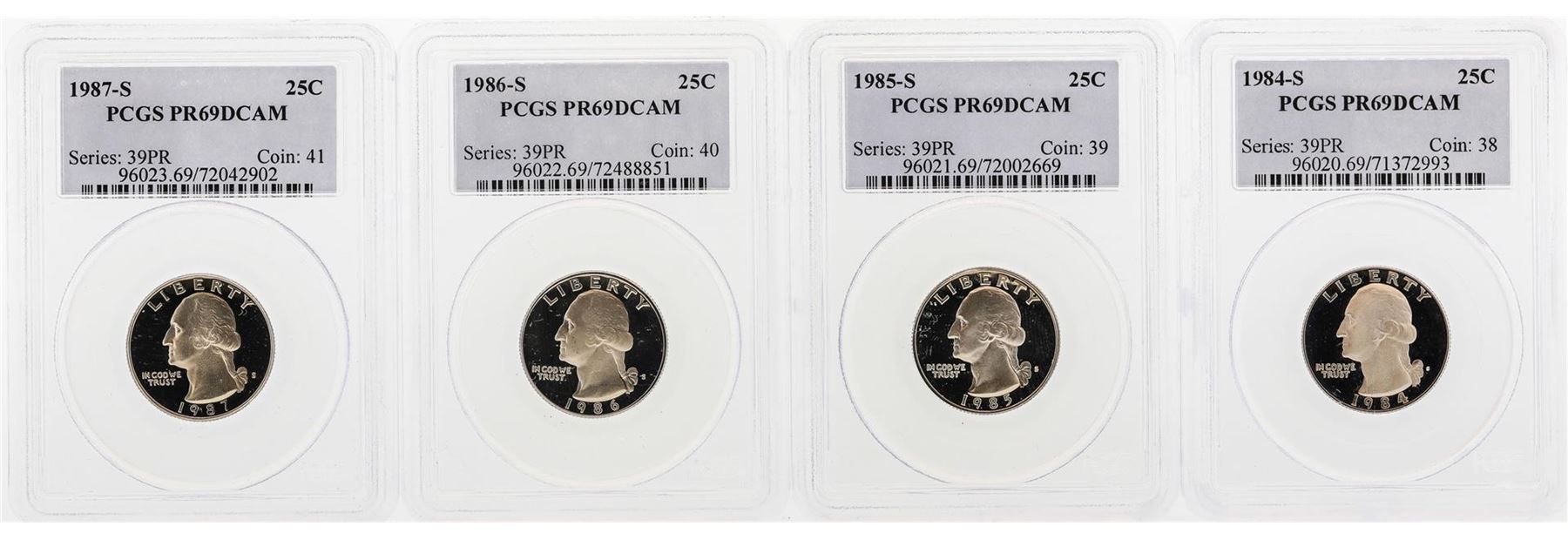 One Set of 1984-S to 1987-S Washington Quarter Coins PCGS PR69DCAM. PCGS Graded.