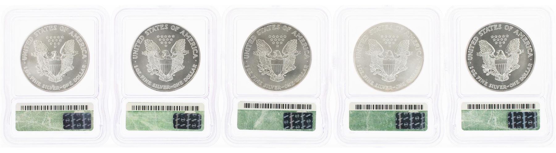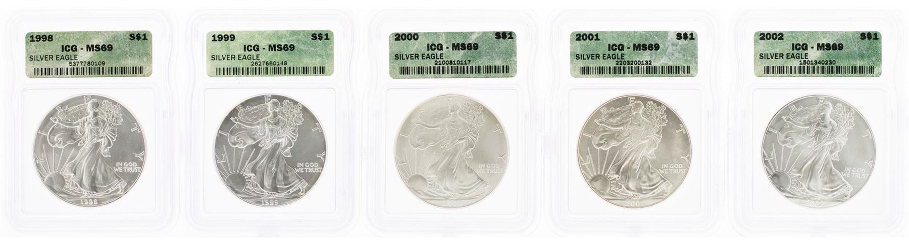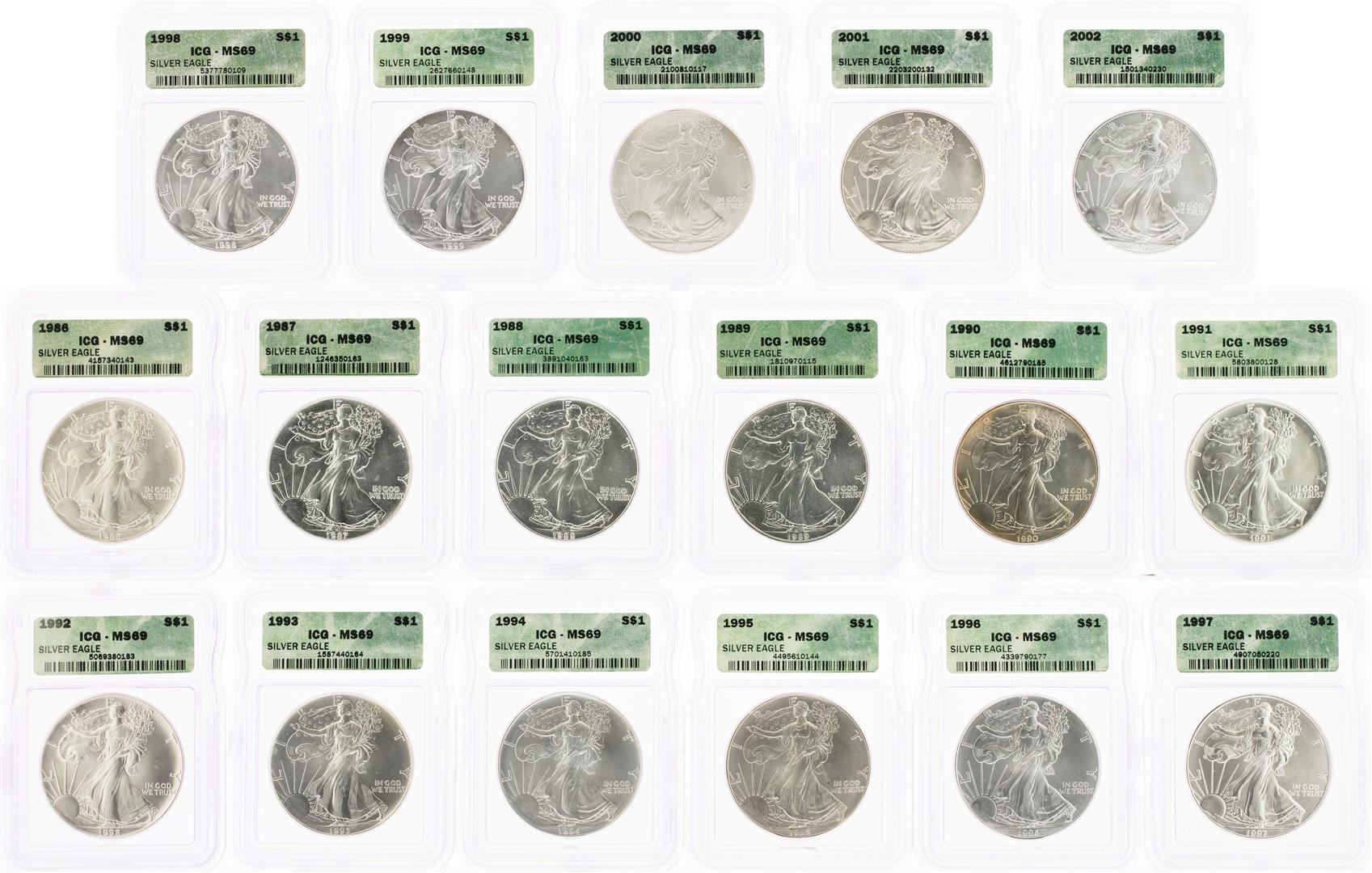 One Set of 1986-2002 $ American Silver Eagle Coins ICG MS69. ICG Certified.