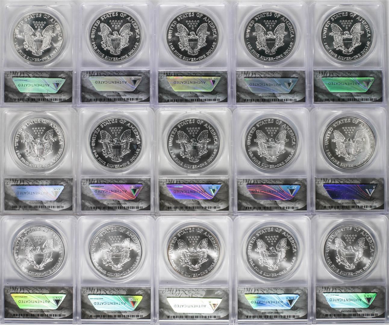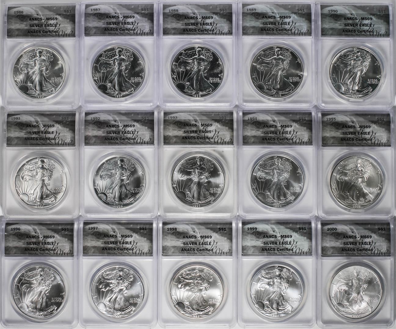 One Set of 1986-2010 $1 American Silver Eagle Coins ANACS MS69 in Box. ANACS Certified.