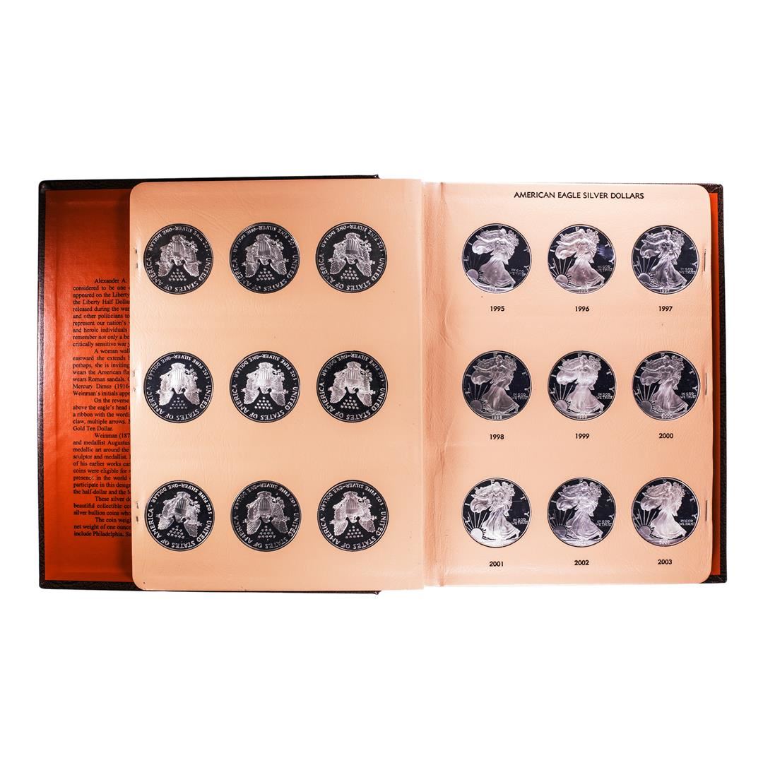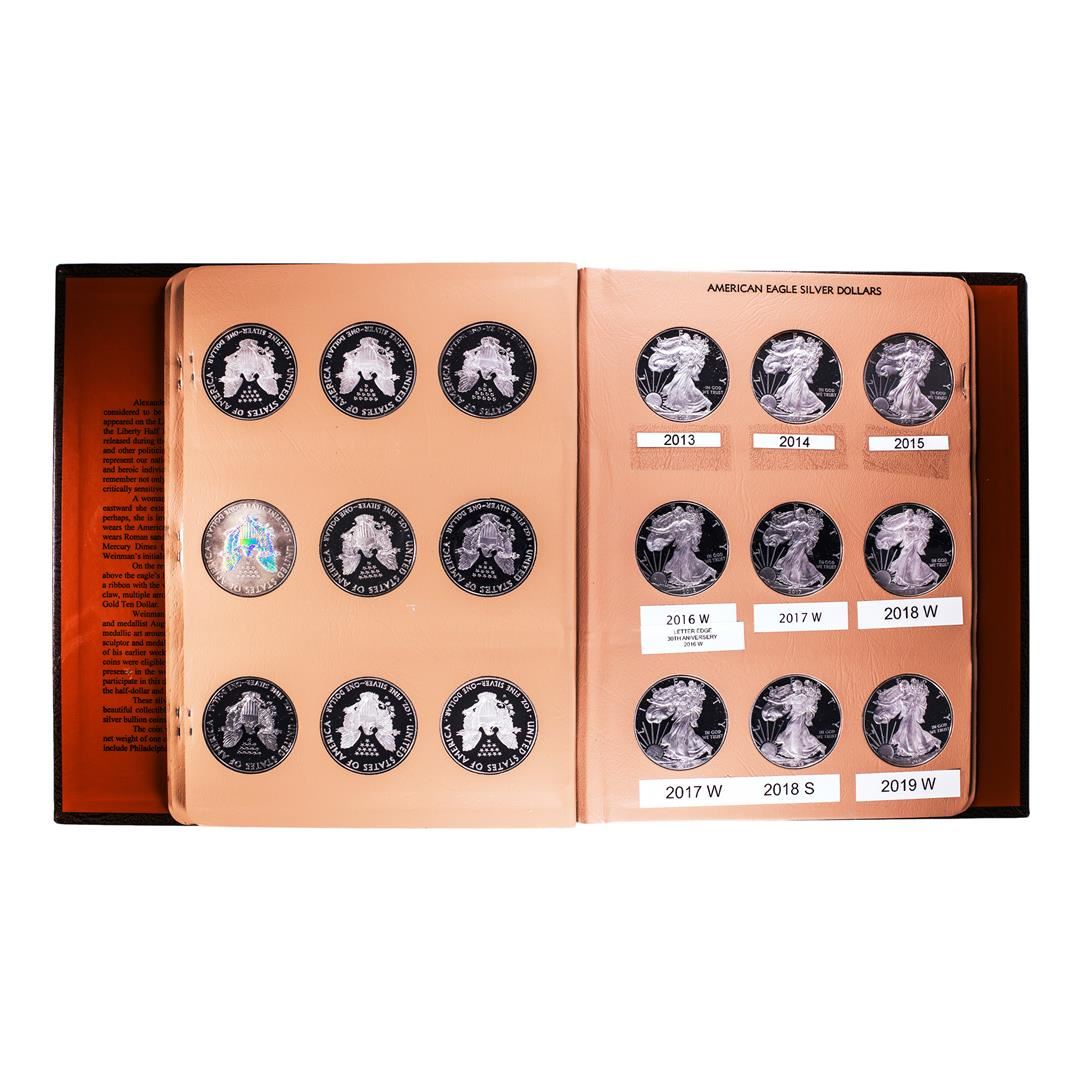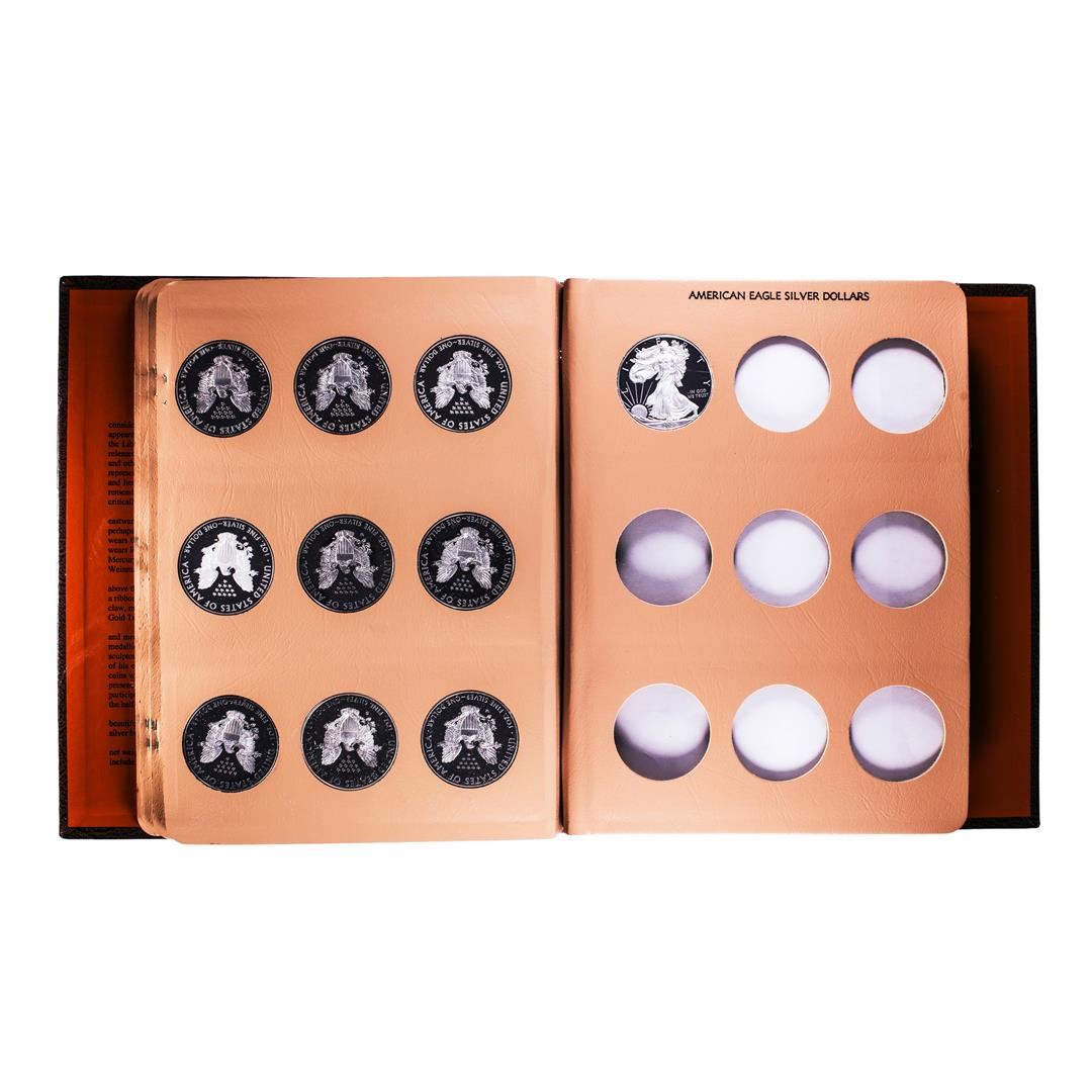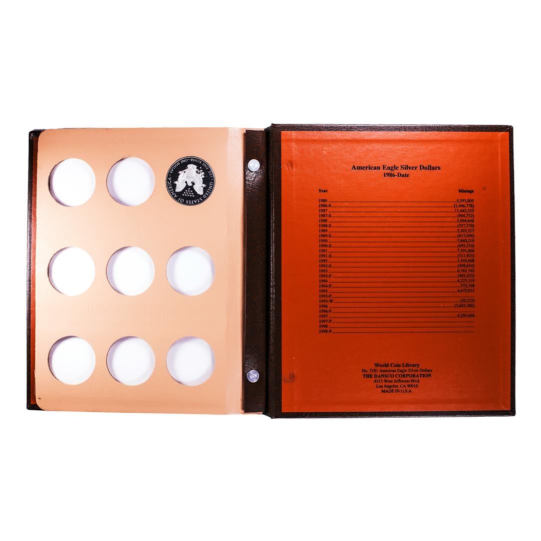 One Set of 1986-2020 $1 Proof American Silver Eagle (37) Coins in Dansco Book, please note that the 2009 coin appears to have been altered with a hologram finish.