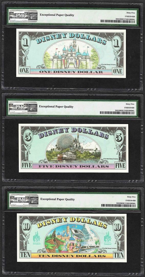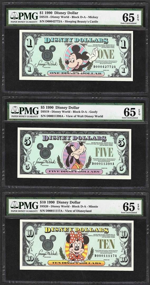 One Set of 1990 $1/$5/$10 Disney Dollars Notes PMG Gem Uncirculated 65EPQ.
