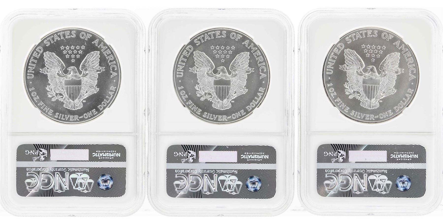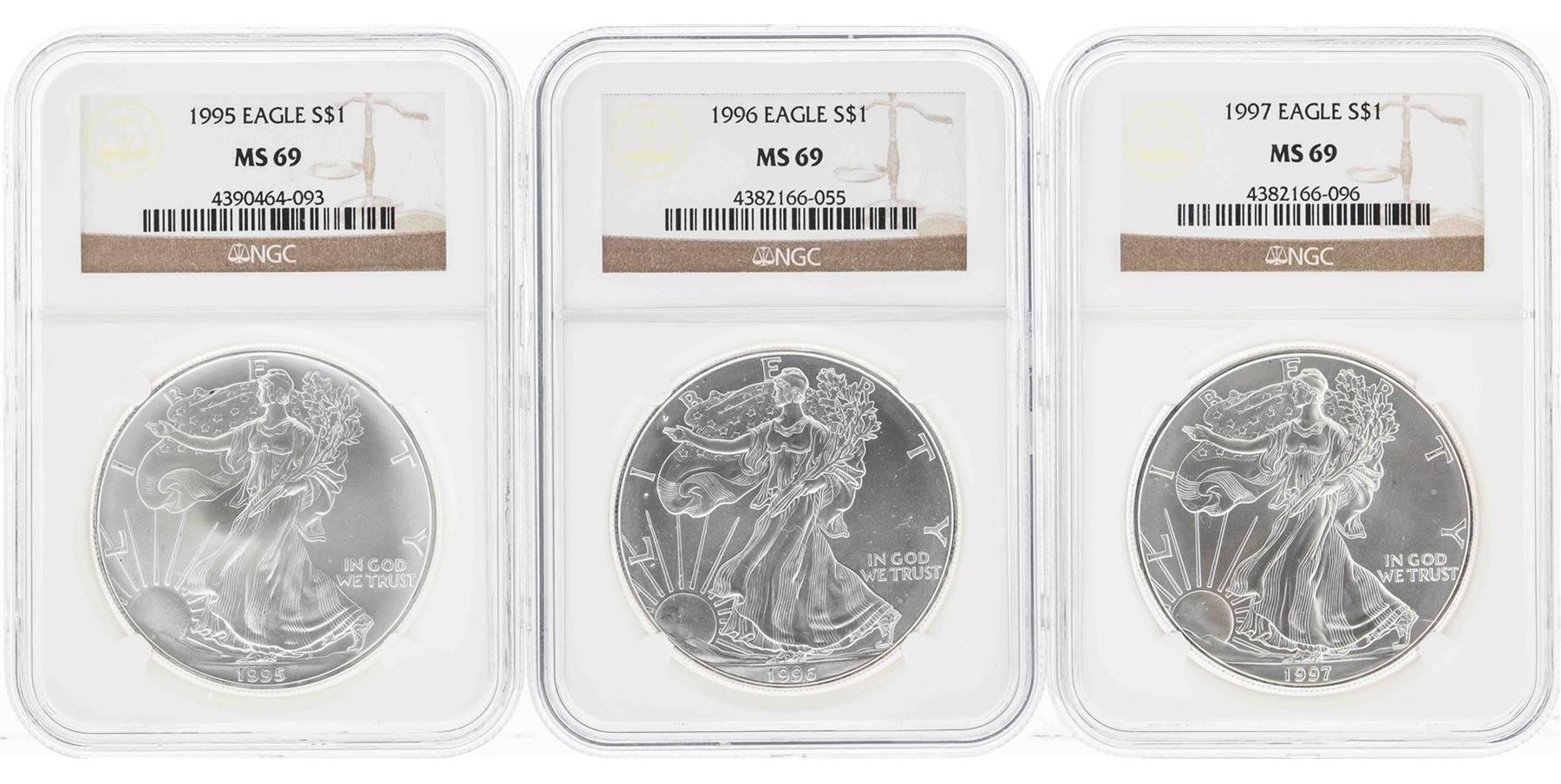 One Set of 1995-1997 $1 American Silver Eagle Coins NGC MS69. NGC Certified.