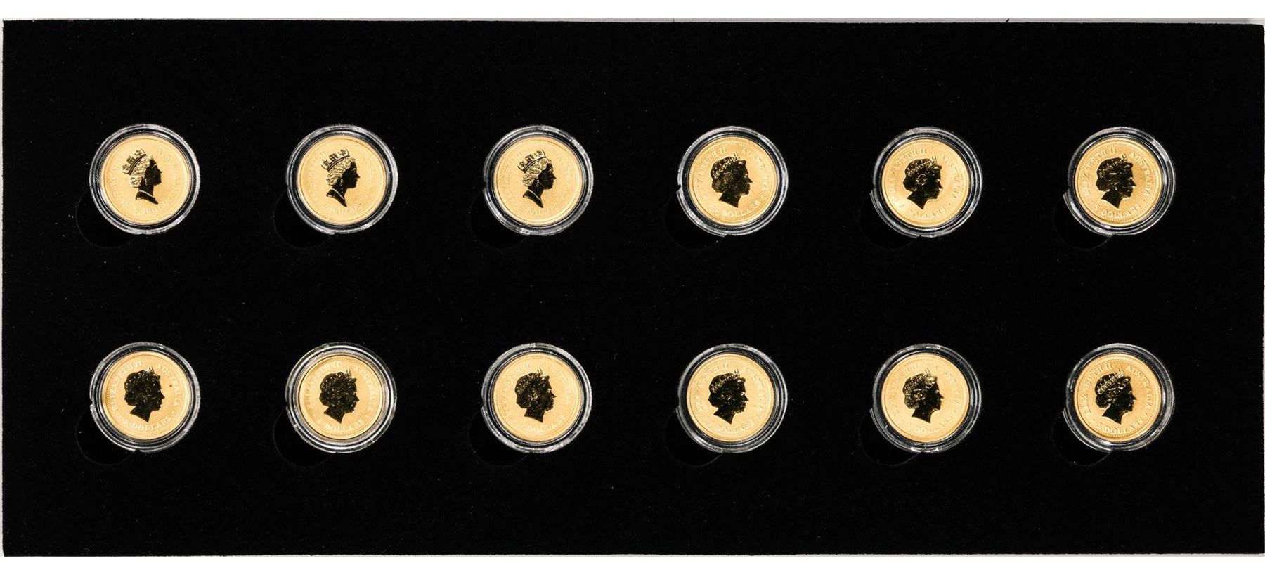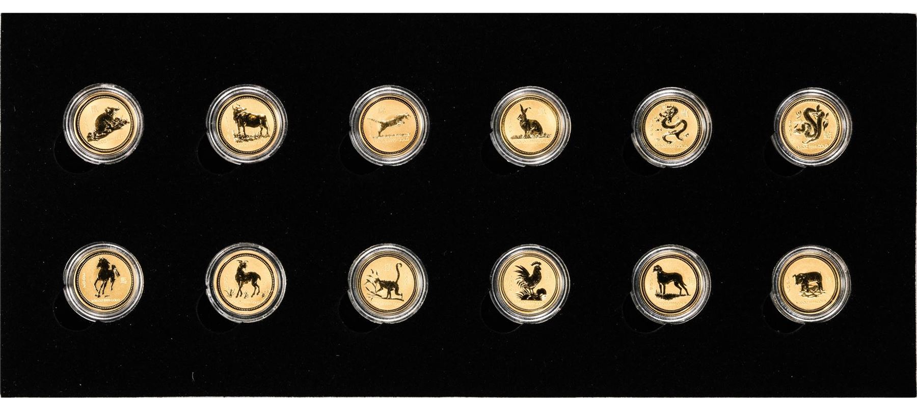 One Set of 1996-2007 $5 Australia Reverse Proof Lunar 1/20 oz Gold Coins in Box.