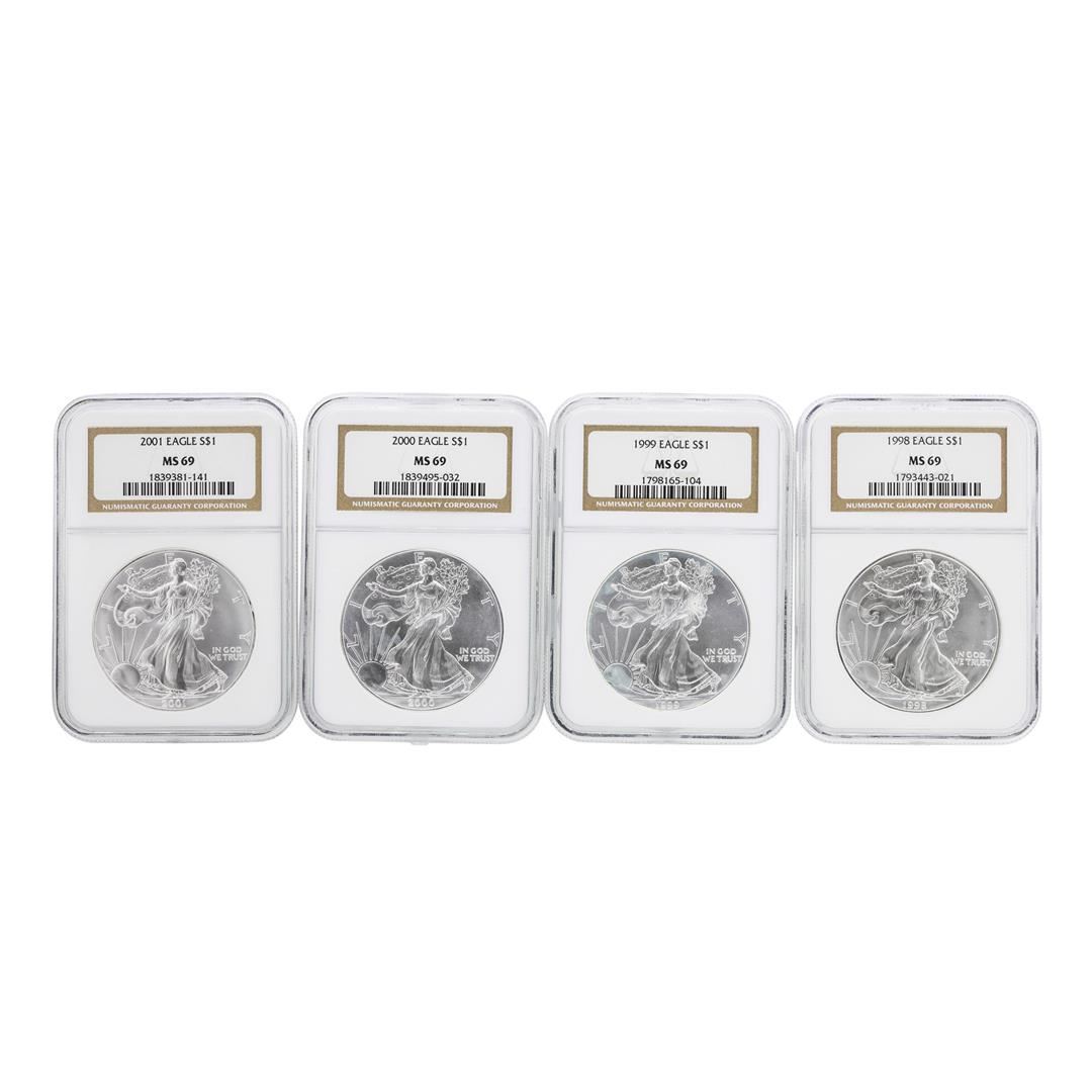 One Set of 1998-2001 $1 American Silver Eagle Coins NGC MS69. NGC Certified.