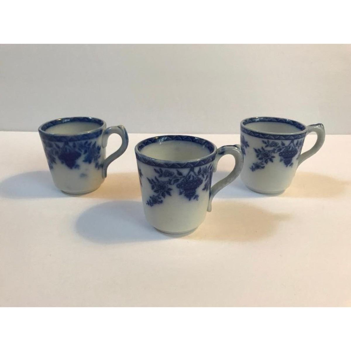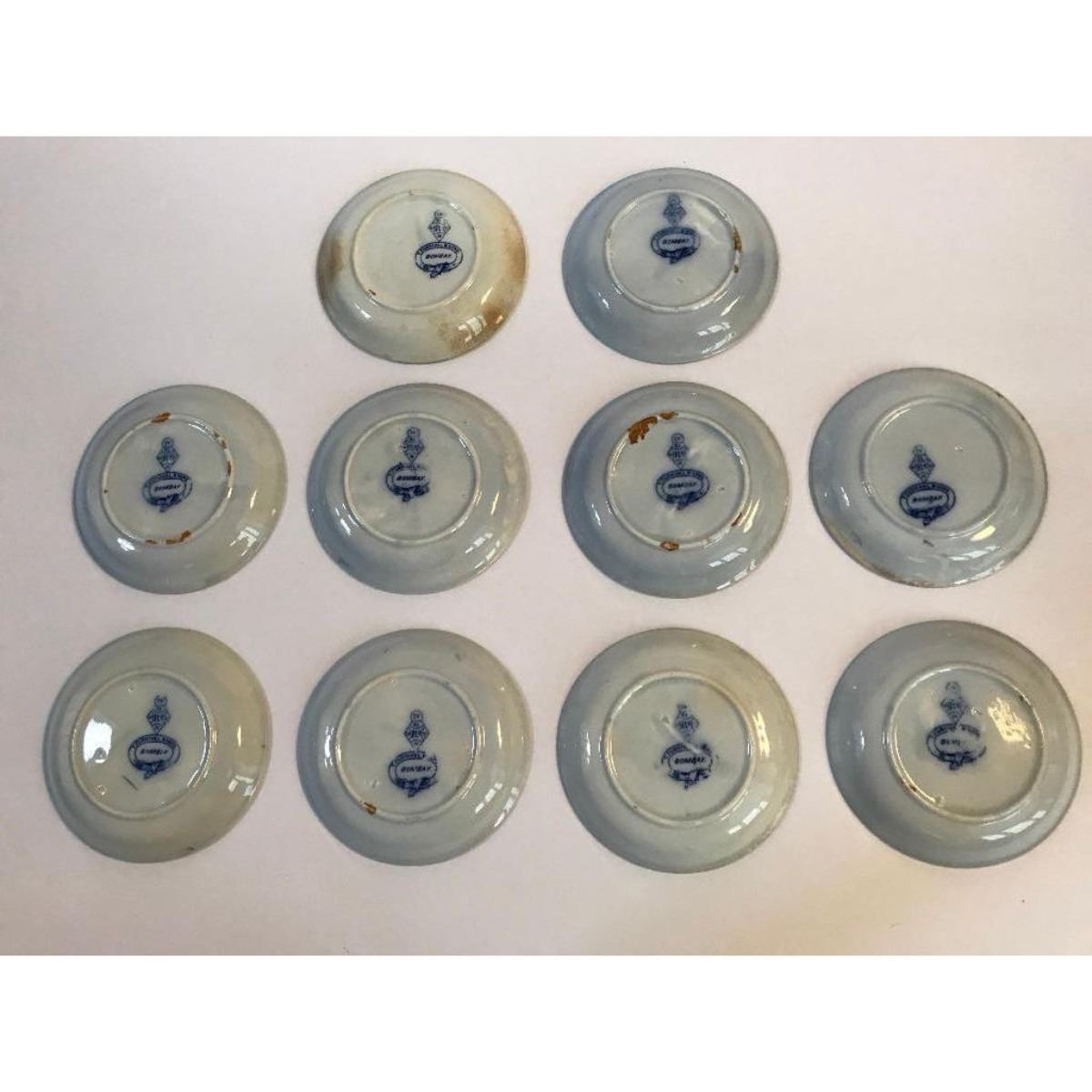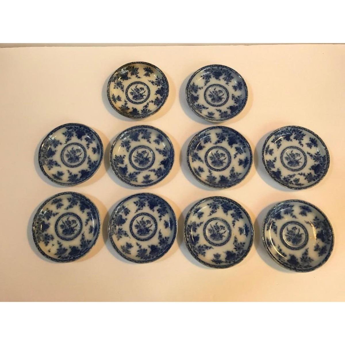 19th Century T Furnival & Sons English Flow Blue dinnerware in Bombay pattern. Set to include: 10 saucers all stamped with diamond T. Furnival & Sons & Bombay on reverse & 3 matching handled cups. Â 4 1/2" D saucers, 2 1/2" H X 2 1/4" D cups. * some pitting & discoloration on some of the saucers from age.