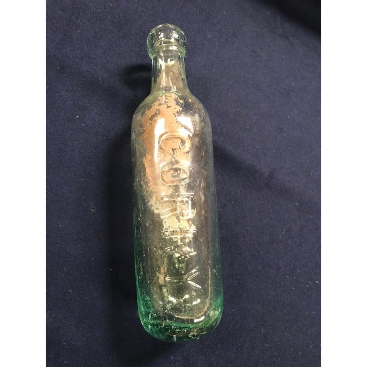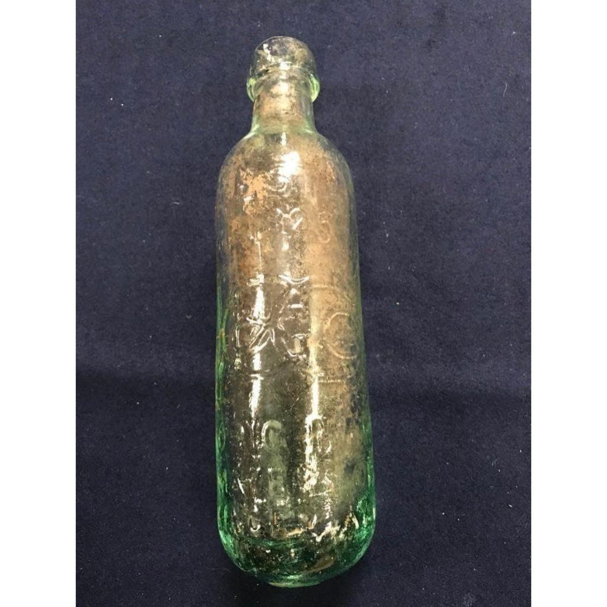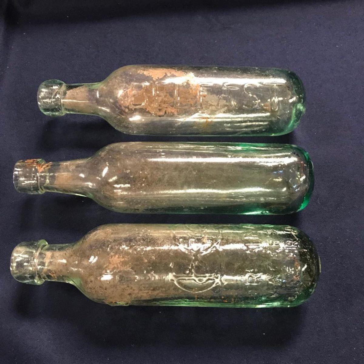 19th Century ginger ale soda bottles ( set of 3 ) recovered from an old privy in Beaufort SC. Two of the bottles are strongly embossed, on one side GRATTAN & CO. LTD. BELFAST IRELAND. The opposite side embossed, “ESTD 1825 - Large G & Co.†And, “ORIGINAL MAKERS OF GINGER ALE†with insignia. The bottom is embossed with a large “Gâ€. Third bottle is unmarked.  In the 19th Century Soda Bottles were made with rounded bottoms requiring them to be laid down in storage. This positioning kept the cork wet so that the carbon dioxide gas would not leak out and make the soda go flat! Measures: approx. 9" in length x 2 3/8†diameter Grattan & Company Ltd. Belfast Ireland Round Bottom, Cucumber, Ballast, Torpedo Ginger Ale Soda Bottle