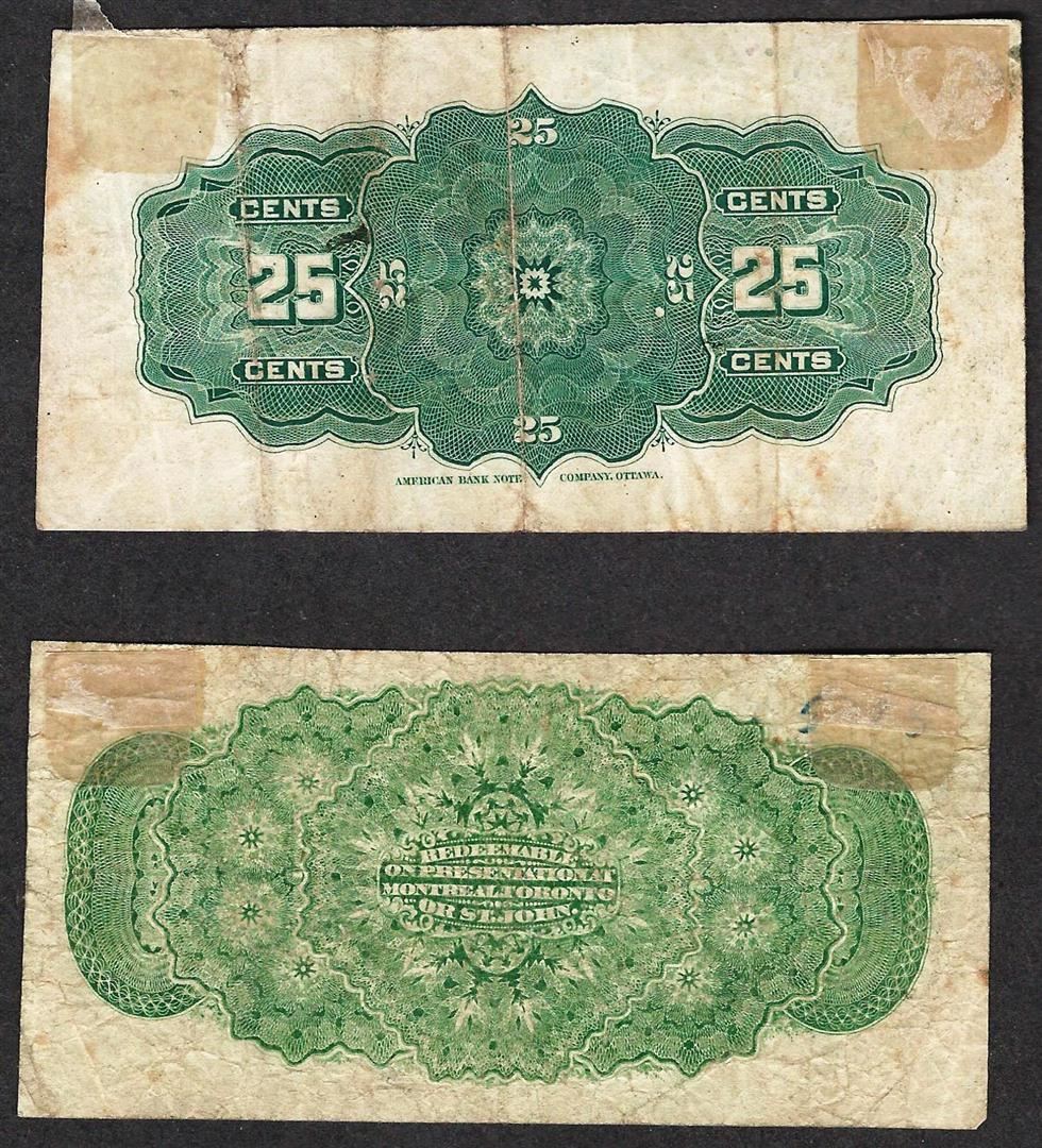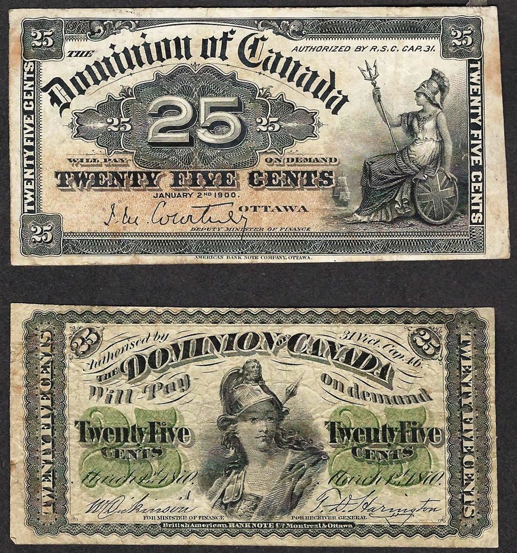 Set of (2) 1870 & 1900 Twenty Five Cents Dominion of Canada Notes