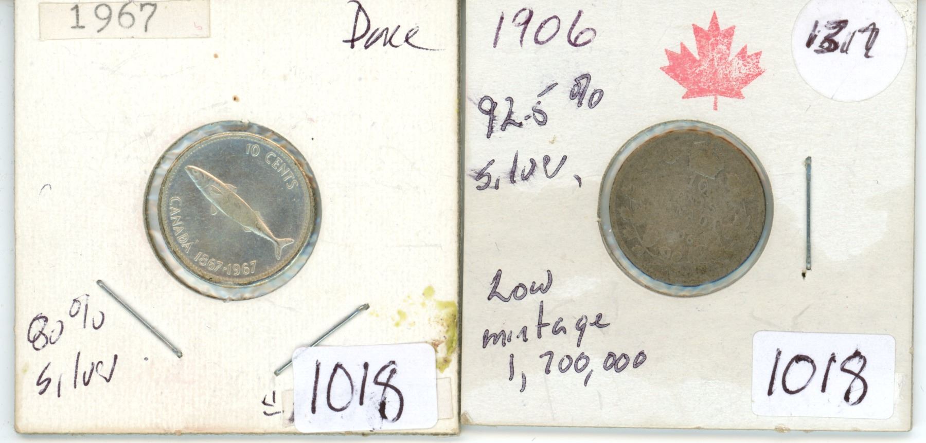Set of 2, 1906 & 1967 Canadian silver dimes