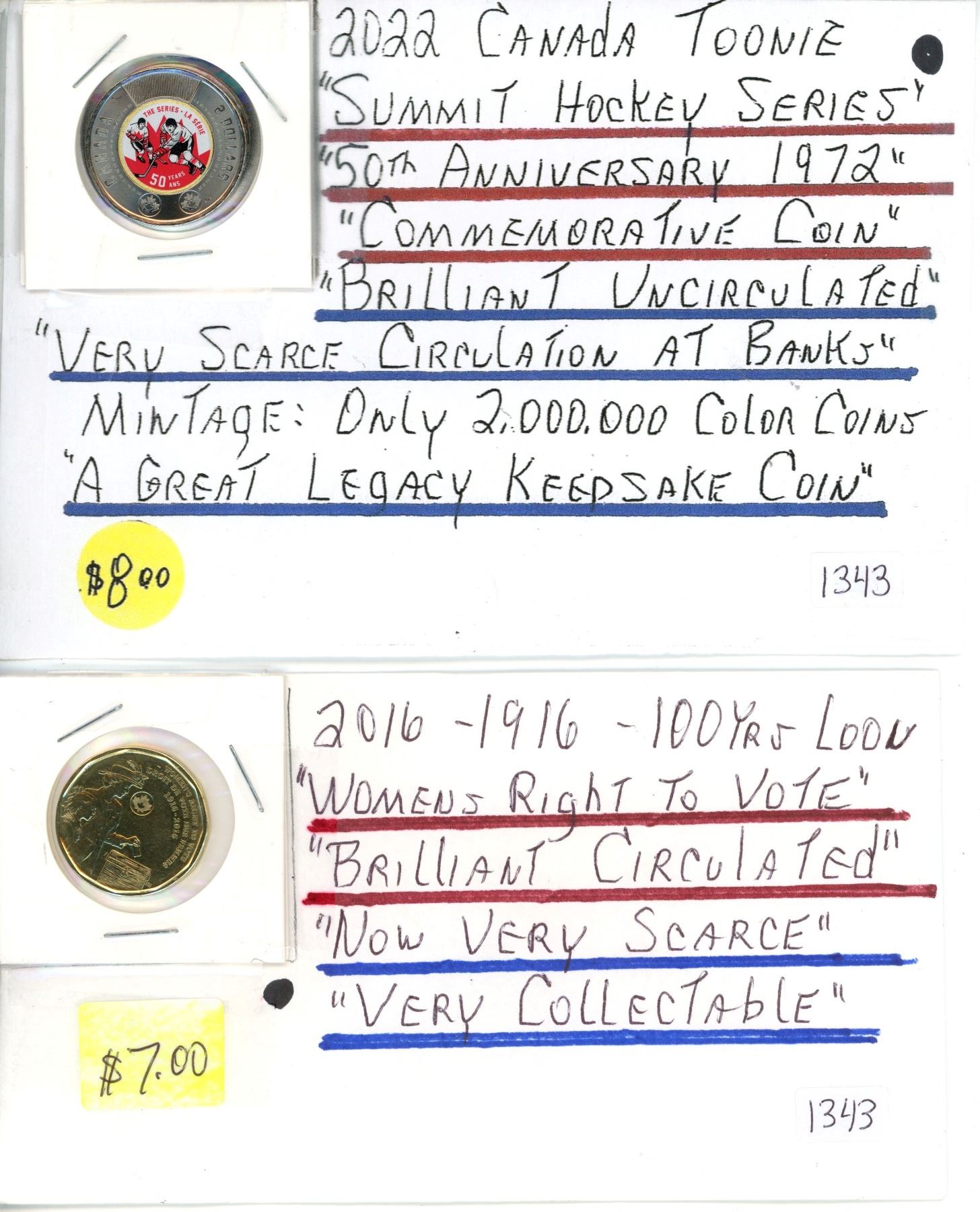 Set of 2, 1916-2016 Woman's right to vote Loonie & 2022 Summit Hockey series Toonie