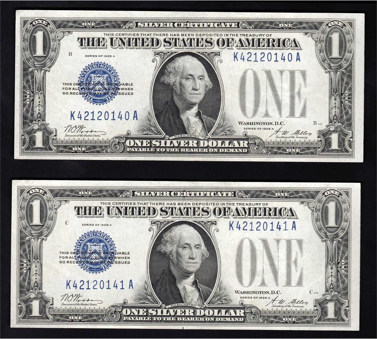 One Set of (2) 1928A $1 Silver Certificate Notes Consecutive Serials.