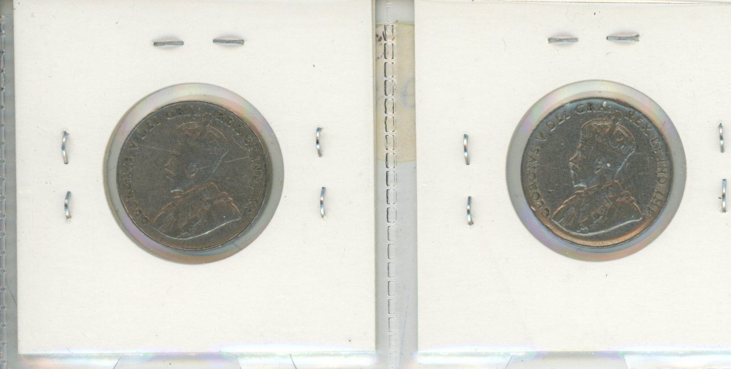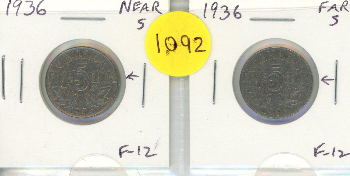 Set of 2 1936 Canadian Nickel 5 Cents Varieties. Includes S Near Rim and S Far from Rim. Both F-12.
