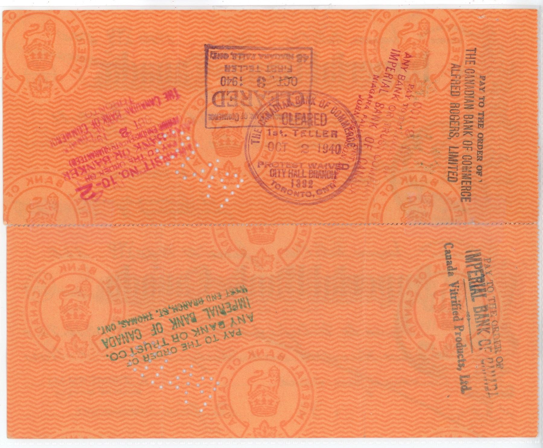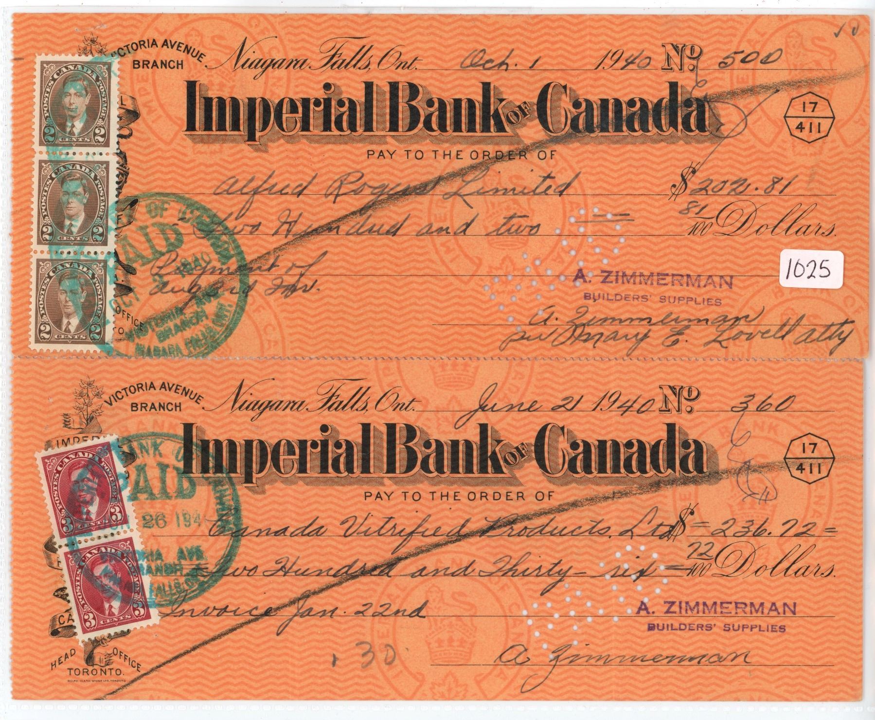 Set of 2, 1940s Imperial Bank of Canada cheques