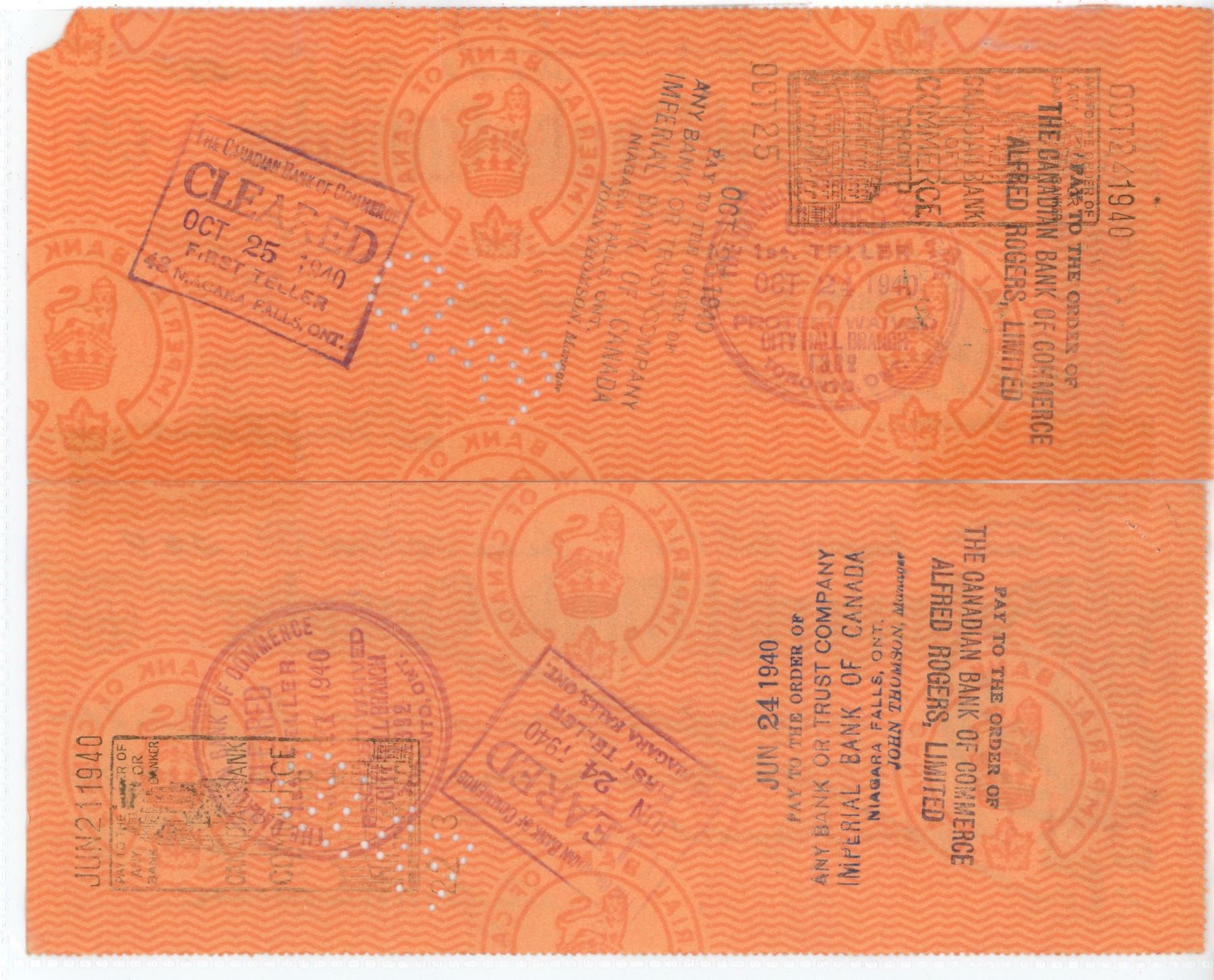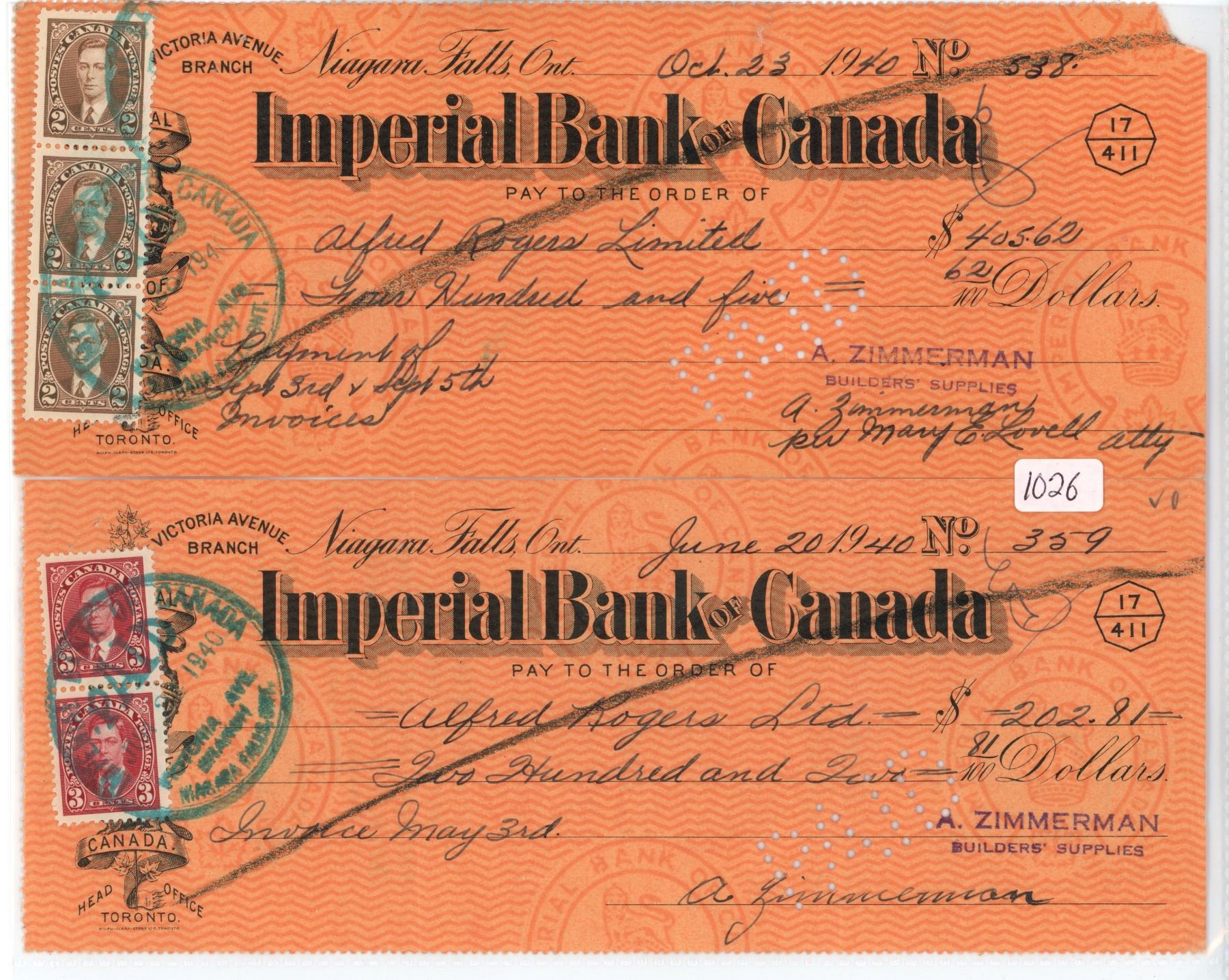 Set of 2, 1940s Imperial Bank of Canada cheques