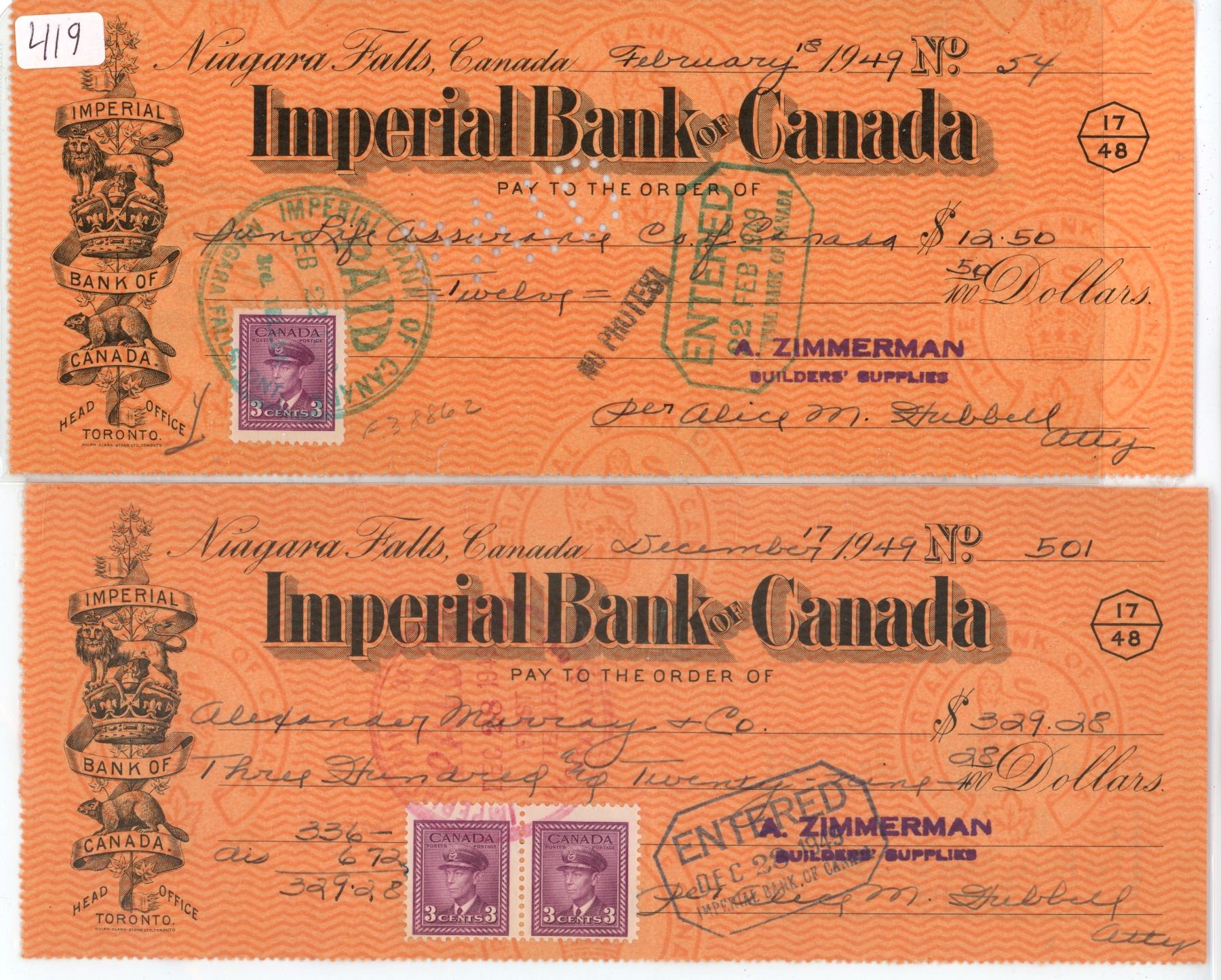 Set of 2, 1949 Imperial Bank of Canada cheques