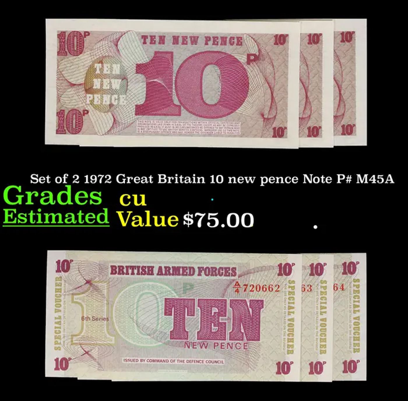 Set of 2 1972 Great Britain 10 new pence Note P# M45A Grades CU.