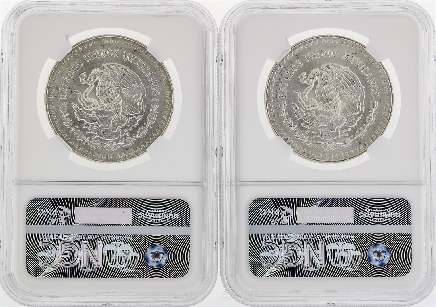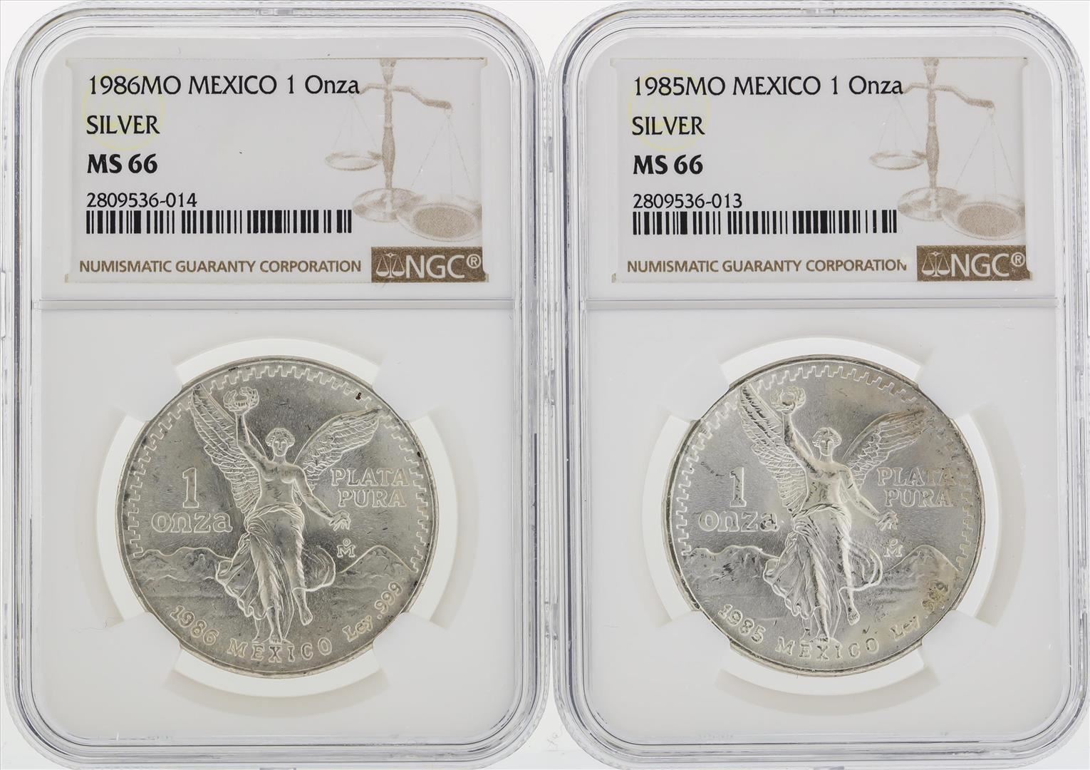 Set of (2) 1985MO and 1986MO Mexico $1 Silver Coins NGC MS66