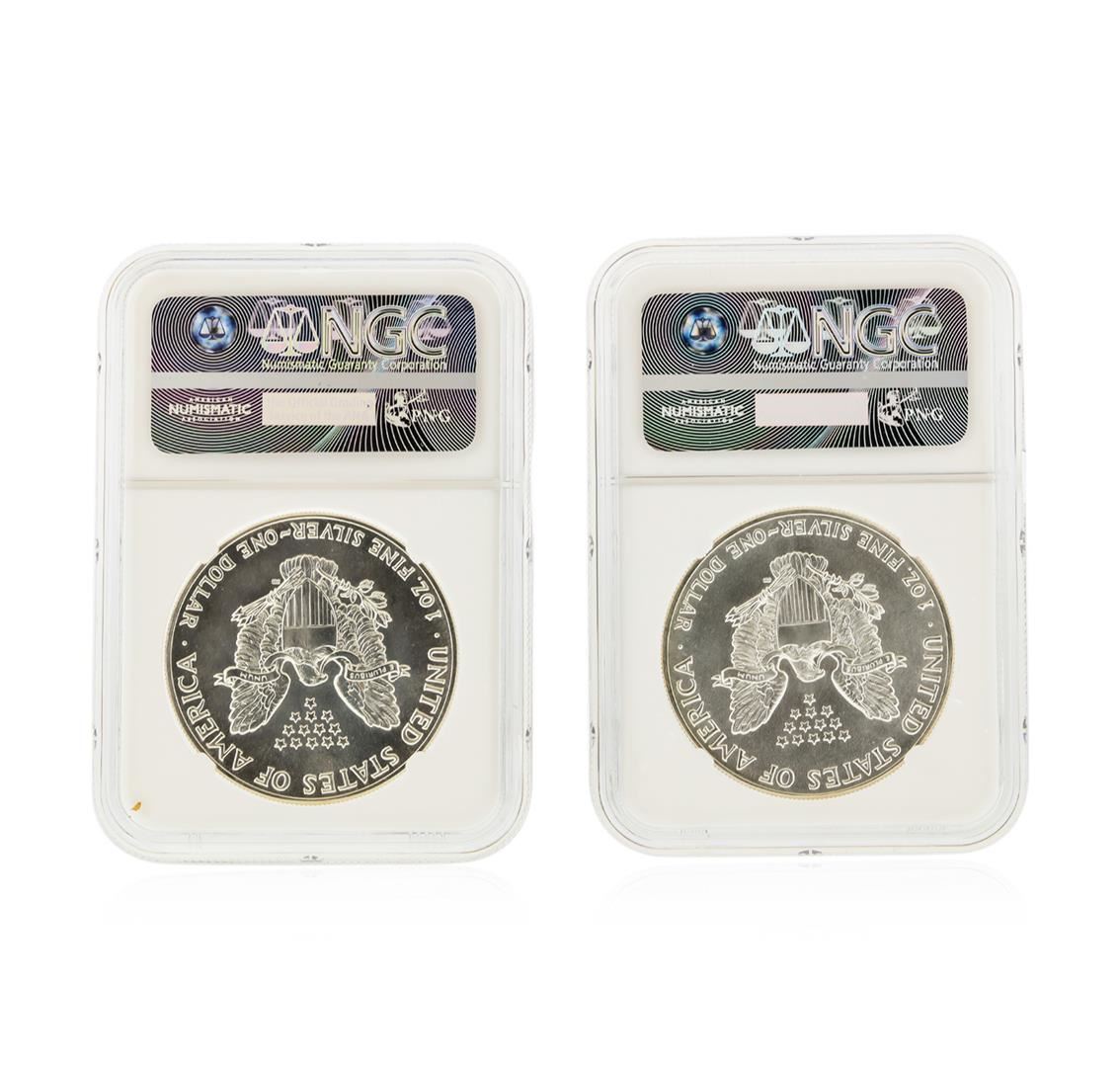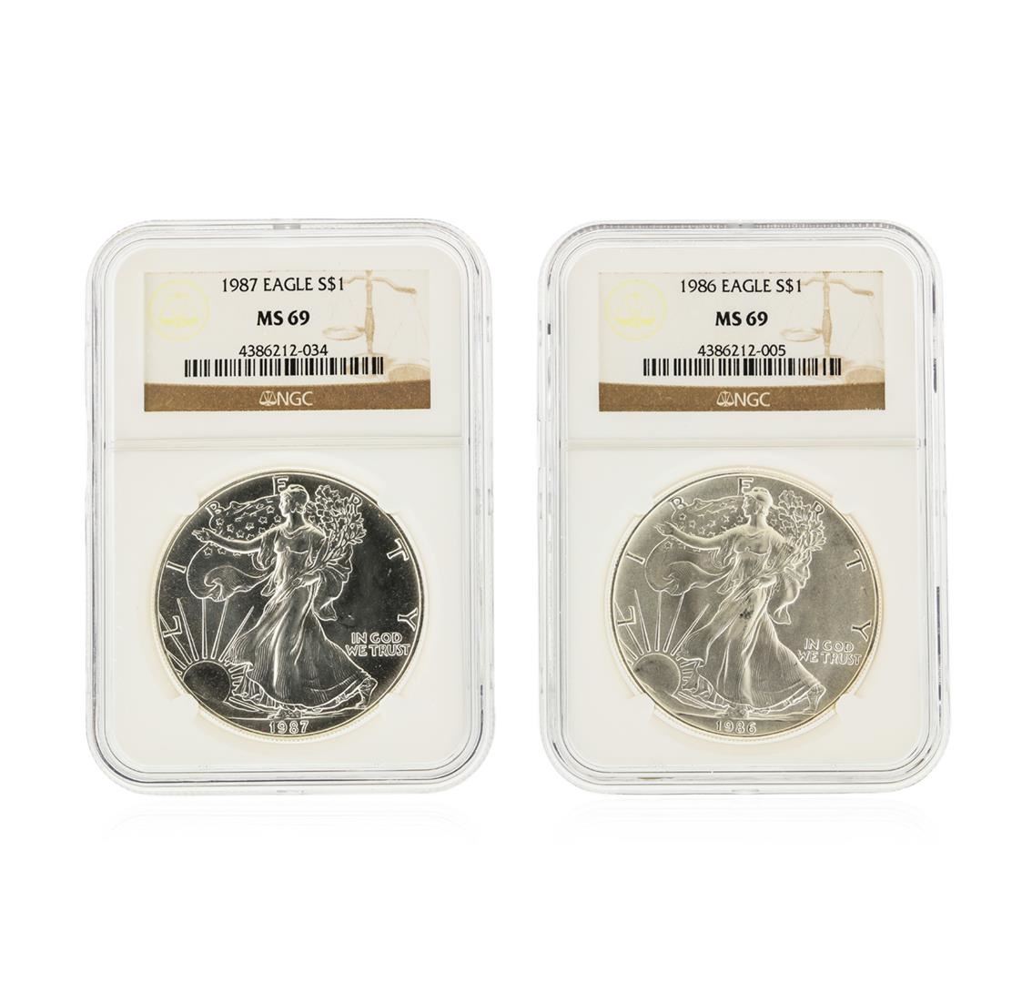 One Set of (2) 1986-1987 $1 Silver Eagle Coins NGC Graded MS69. NGC Certified.