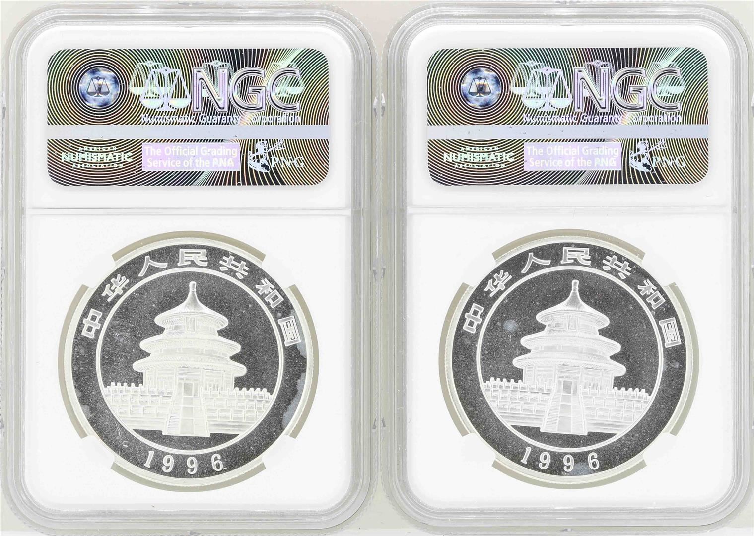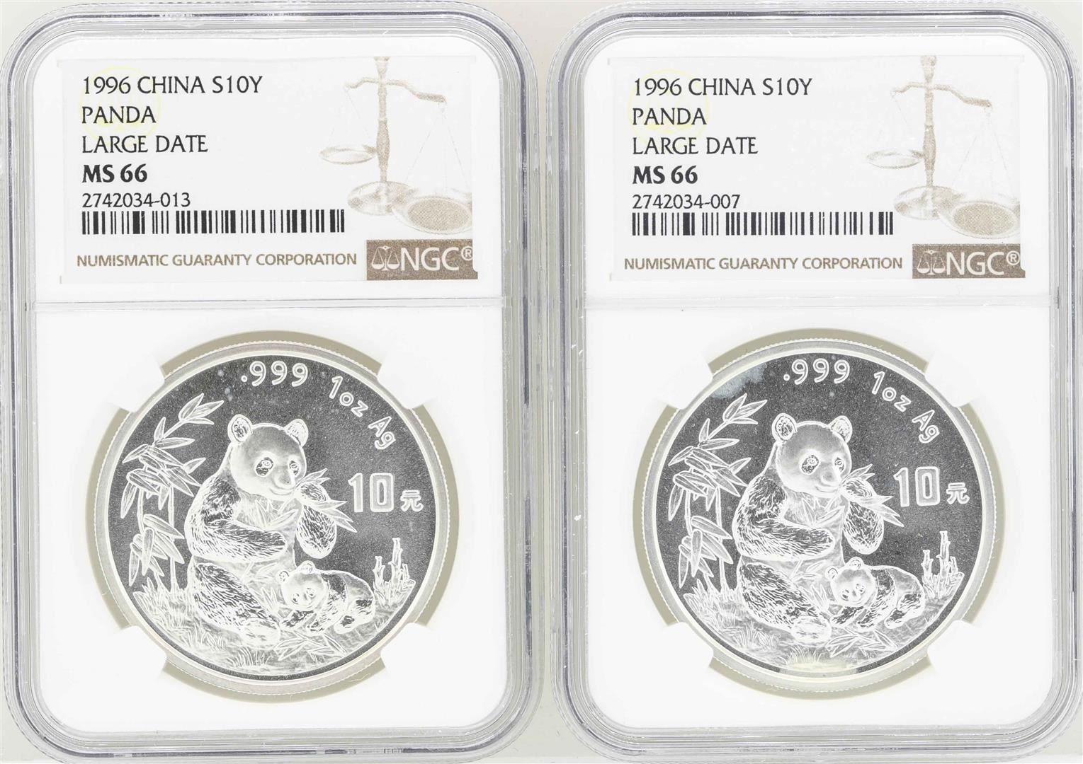 Set of (2) 1996 Large Date China 10 Yuan Silver Panda Coins NGC MS66