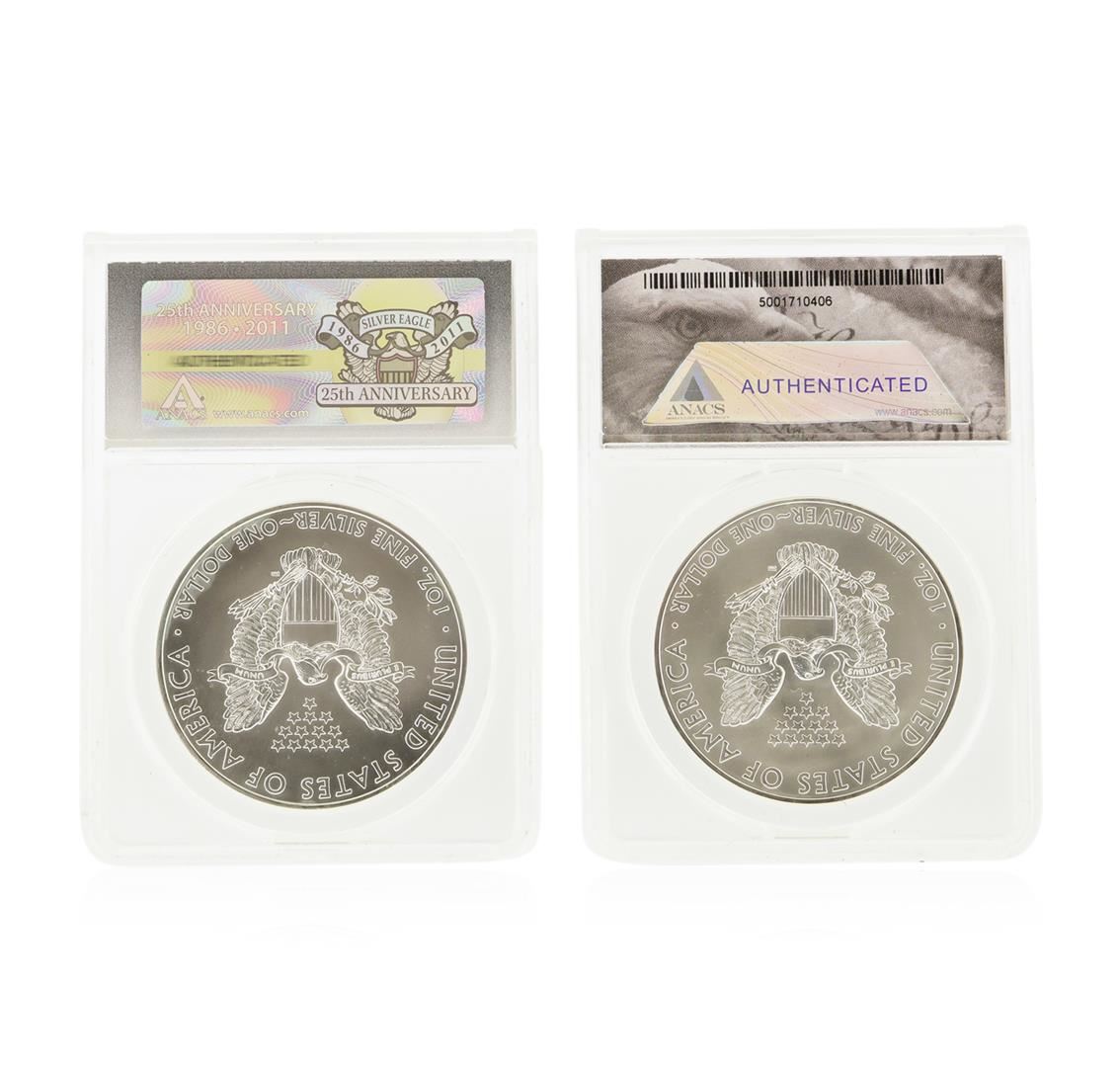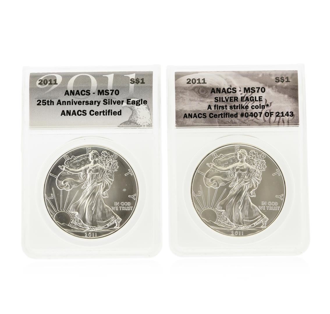 One Set of (2) 2011 $1 American Silver Eagle Coins ANACS MS70. ANACS Certified.