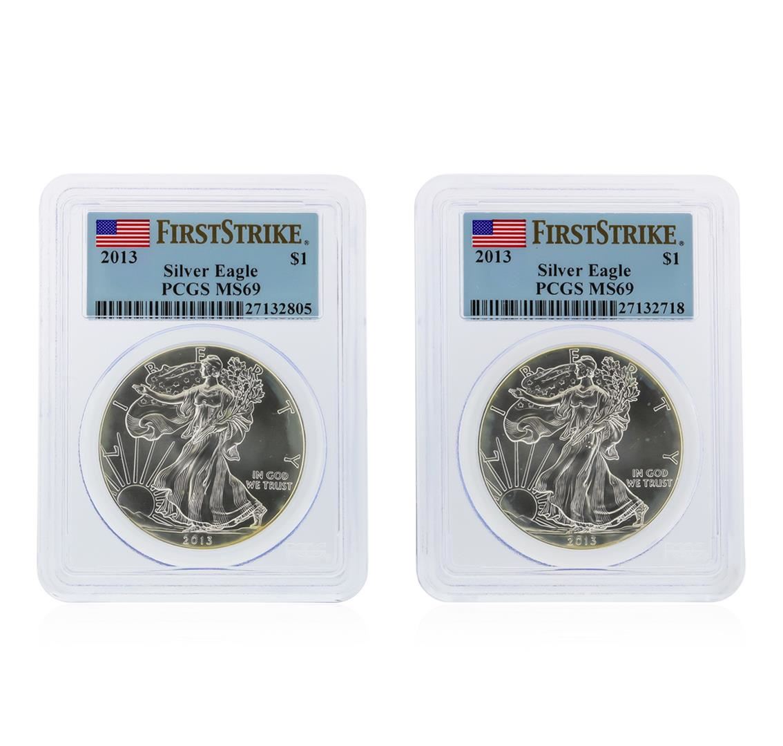 One Set of (2) 2013 $1 Silver Eagle First Strike Coins PCGS MS69. PCGS Graded.