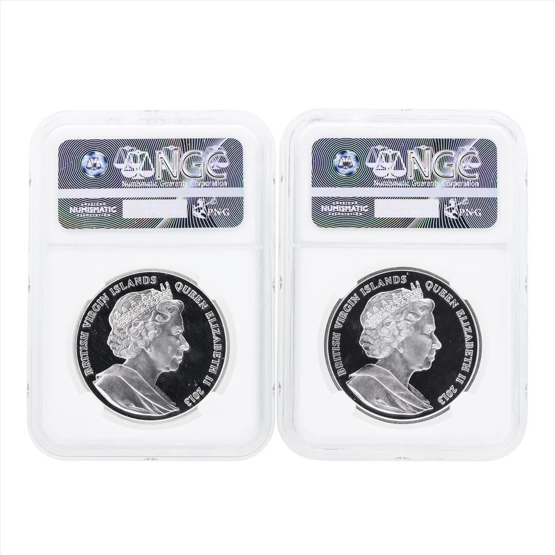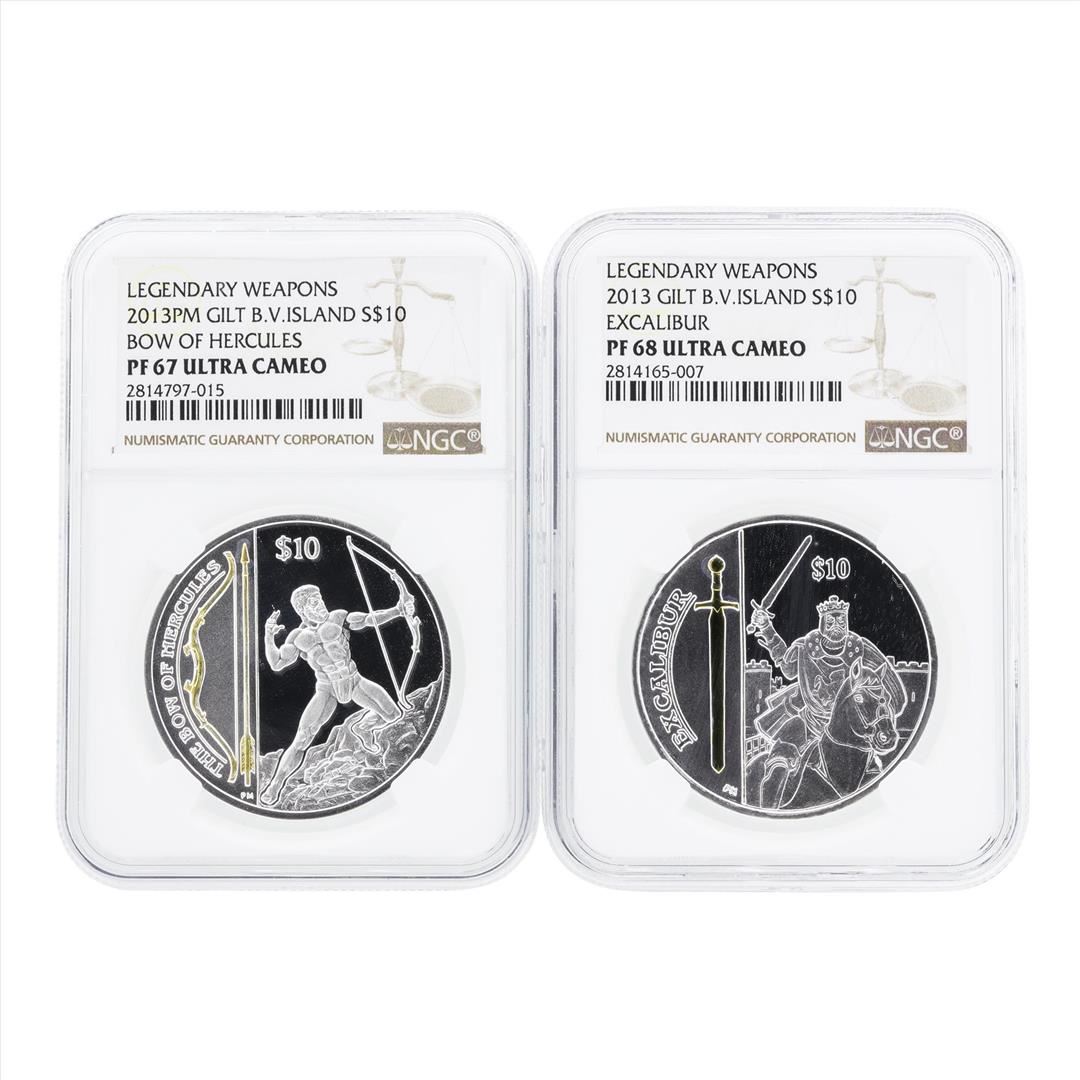 One Set of (2) 2013 Gilt British Virgin Island $10 Legendary Weapons Silver Coins NGC PF67/68.