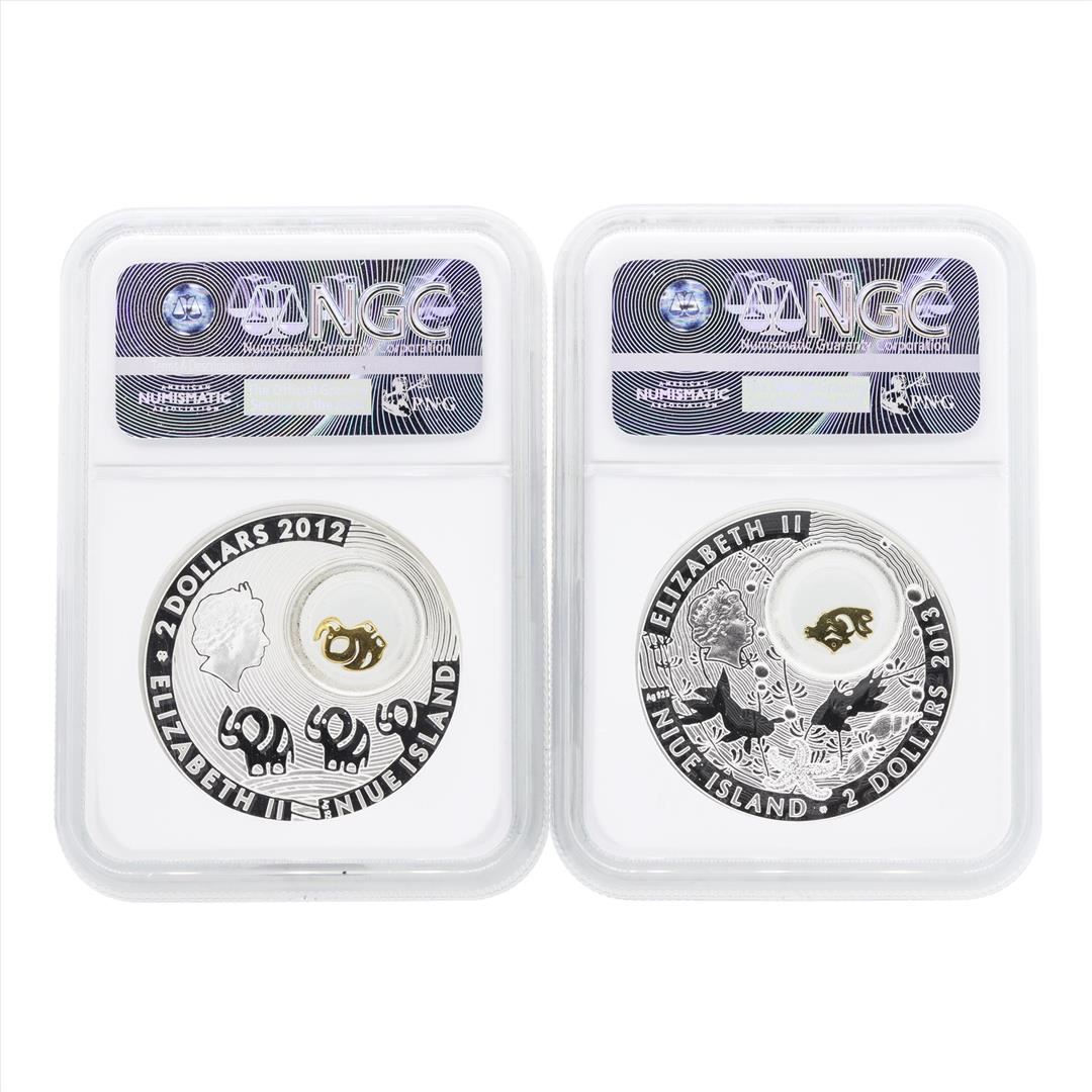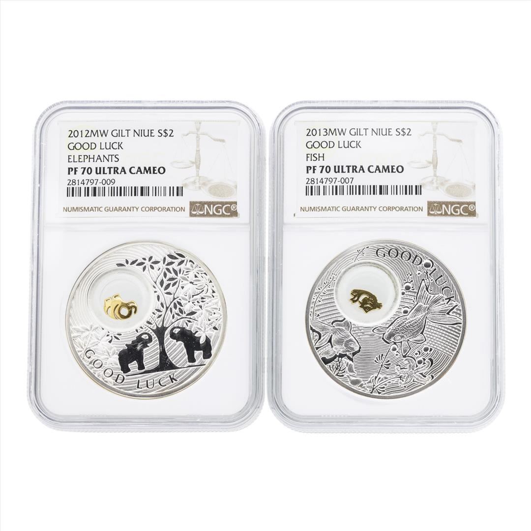 One Set of (2) 2013MW Gilt Niue $2 Good Luck Silver Coins NGC PF70 Ultra Cameo.