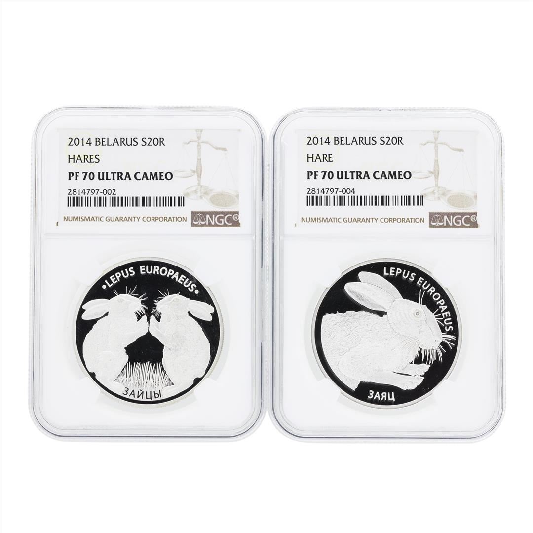 One Set of (2) 2014 Belarus 20 Rubles Hares Silver Coins NGC PF70 Ultra Cameo.